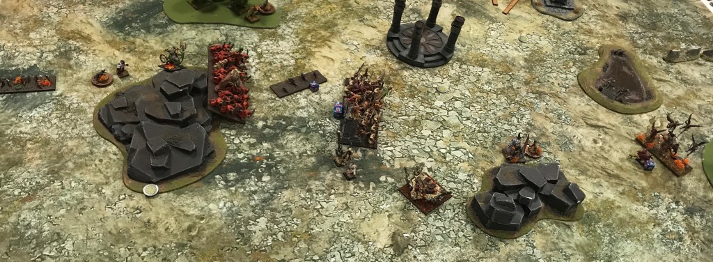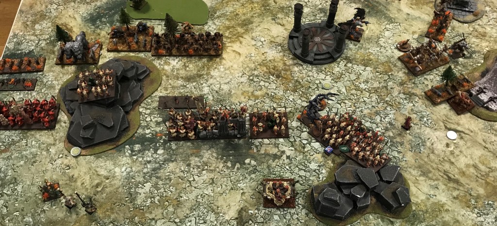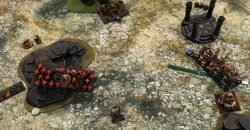 Have a plan – I can find scenario play quite difficult. I tend to get wrapped up in the battle and start thinking far too late about how I’m going to achieve the objectives. In this game I actually went in with a plan that played to my strength. Because rats work best close together (primarily because of rallying) I decided from the outset I would look to secure the objectives on my left and the centre, whilst trying to prevent my opponent from accessing his. This meant I was able to concentrate my forces over a smaller area taking advantage of rallying and cloak of death support as much as possible, but also allowing relatively short range spells like fireball and banechant to be easily deployed where they were needed.