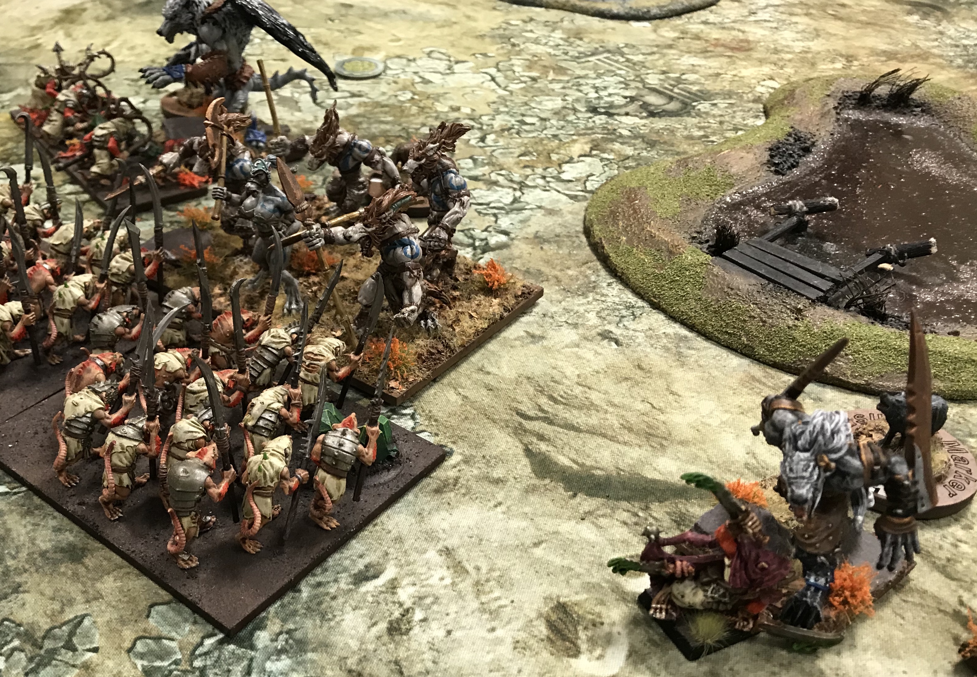 The lightening struck Beast of Nature, crashed into the exposed flank of the Spear horde. Vermin bodies were broken and tossed aside, but the horde remained. The Gur Panthers pulled back from the Night Terror and ran towards the Spear horde eager to join the fight. As Moonfang and the winged Beast of Nature also turned their attentions in the direction of the Spears, the Lycans charged the Night Terror. Still struggling to find a grip on the slippery lakeside the creature was rapidly torn apart by the wolfmen who were more at home in the varied terrain of the out-of-tunnel.
