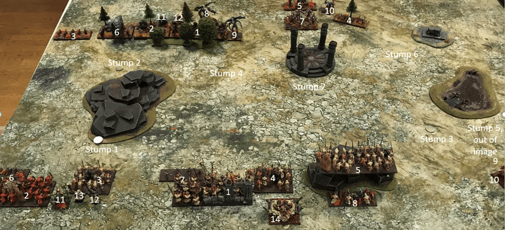 The central Shock Troops had reached the centre stump, noticing another not far away they ran to secure it. The Tangle advanced into the centre claiming the final stump and releasing a gout of flames that drove the harpies from the field.