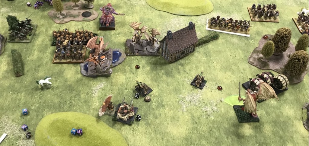 The rats turn to do some damage (kind of). The Shock Troops destroyed the Knights and turned to face the Order of Redemption in such a way that if the knights charged them they would be hindered. The Tangle struck back against the Beast of Nature but failed to wound it, annoyingly making flying an option in the next turn. Scud charged a horde of the Foresaken, hurting them but not getting the kill, and the Hackpaws on the right finally killed the knights. In a final act of preparation the Fiend turned to face the back of the Foresaken.