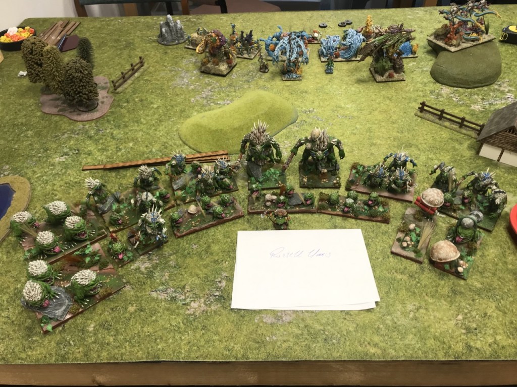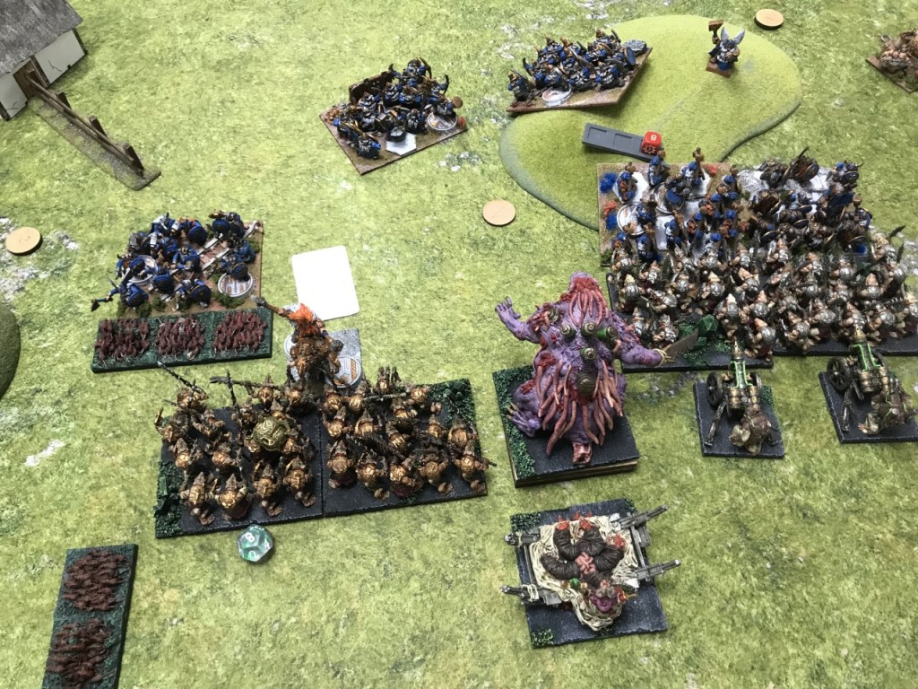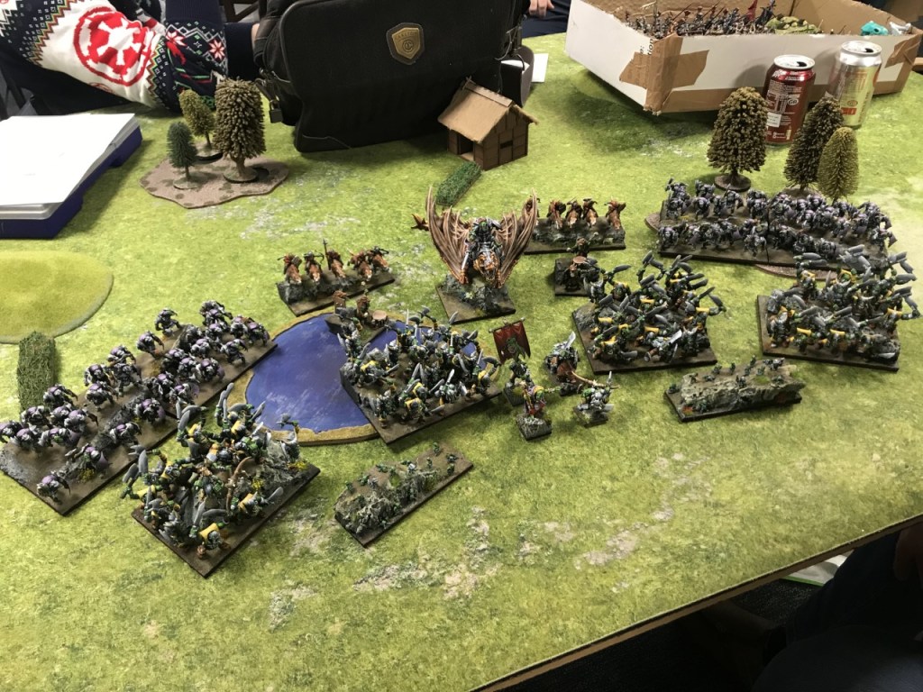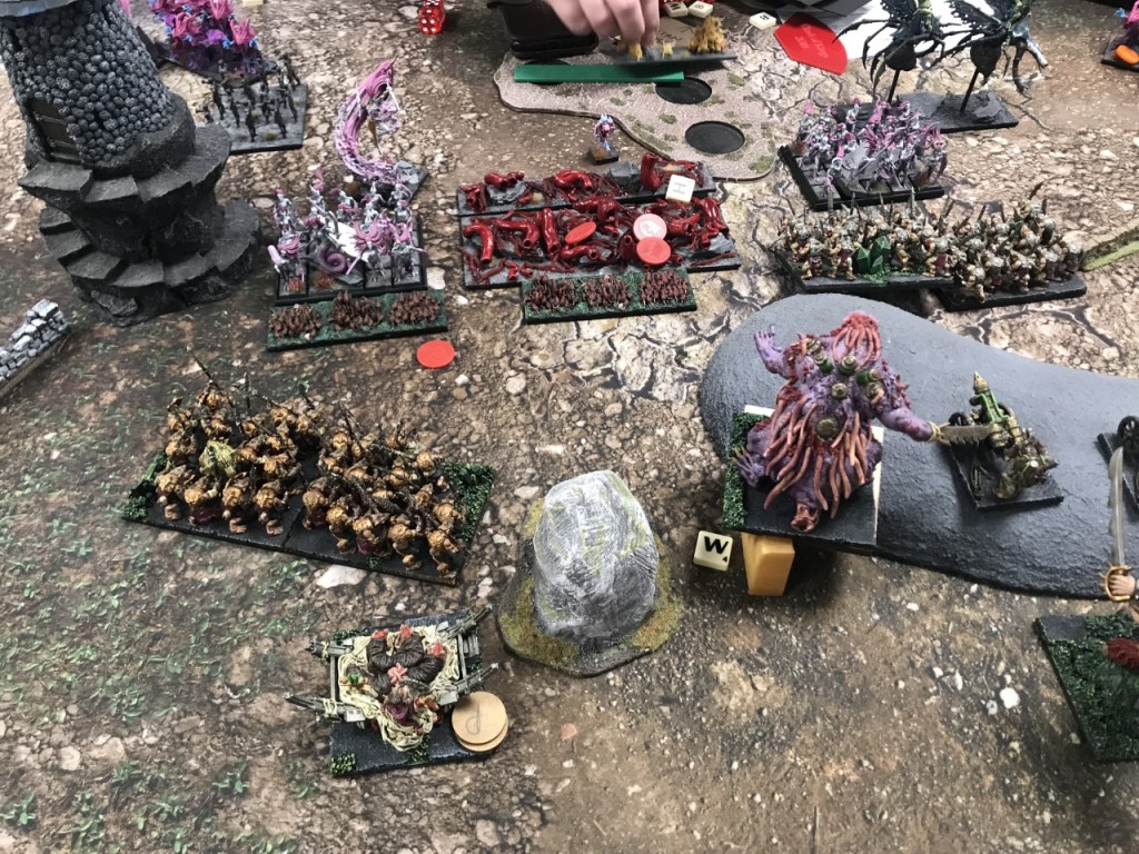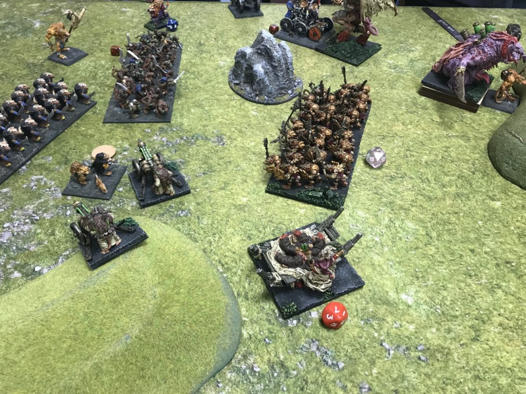 This is my first ever time playing against Ratkin, and what a way to start. The army was very different to mine, including the new shooting formation and no less than 4 infantry hordes (also no more, so basically exactly 4 infantry hordes). It was undoubtedly a hard slog that gave me a really useful insight into how annoying Broodmothers are. It was a real nail biter down to the final whistle where a turn 7 may well have swung the result, but didn’t get rolled. All in all, it was massively enjoyable and a great start to the day.