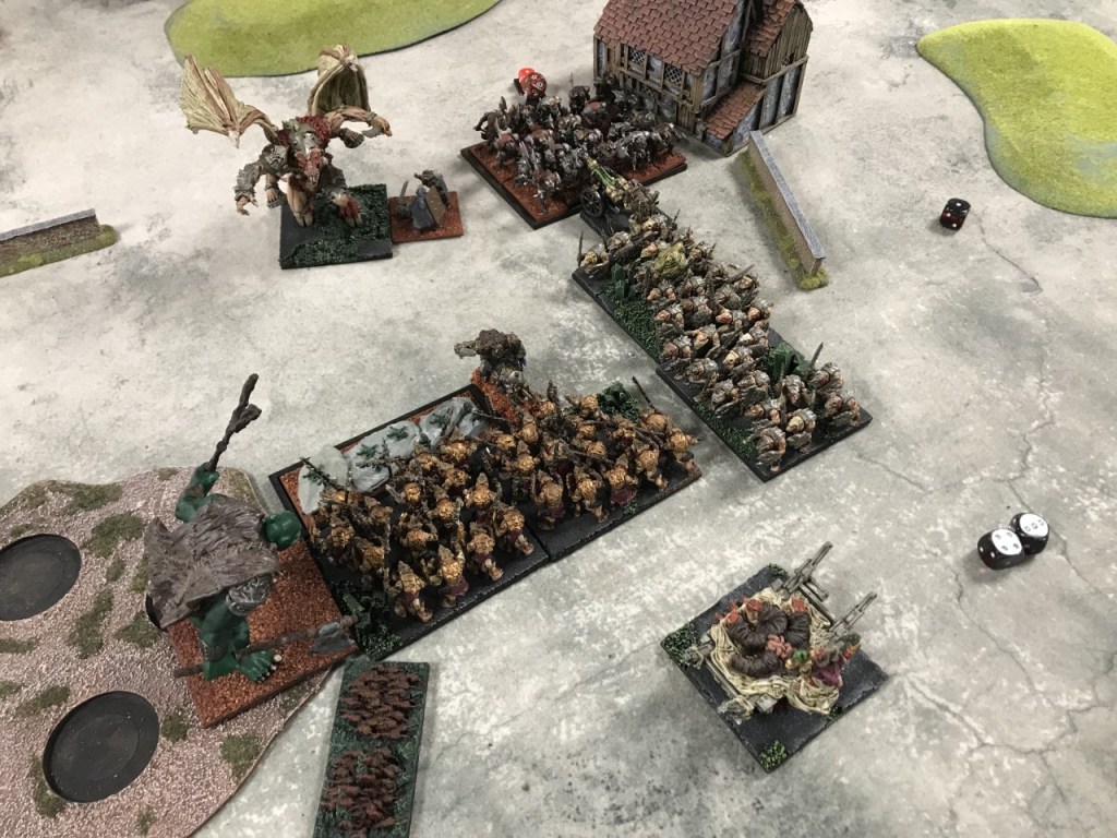 Mistakes and bad dice followed me into this game from the last. In my second turn I mistakenly opened up a flank on a Hackpaw Regiment to a Brock Rider Troop (although to be fair the Brocks took about three turns to kill them which was the one respite in this game). My Warrior Horde then got taken down a turn earlier than expected thanks to a roll of double nine on the nerve test which opened up lots of flanks for Dwarf Regiments to get stuck into. Then to top it all off Scud failed to deal with a Dwarf Lord on a Beast before the Lord dealt with him in 2 turns. Basically, another tough game, which I have to admit, following the previous game, didn’t exactly have me jumping with joy.