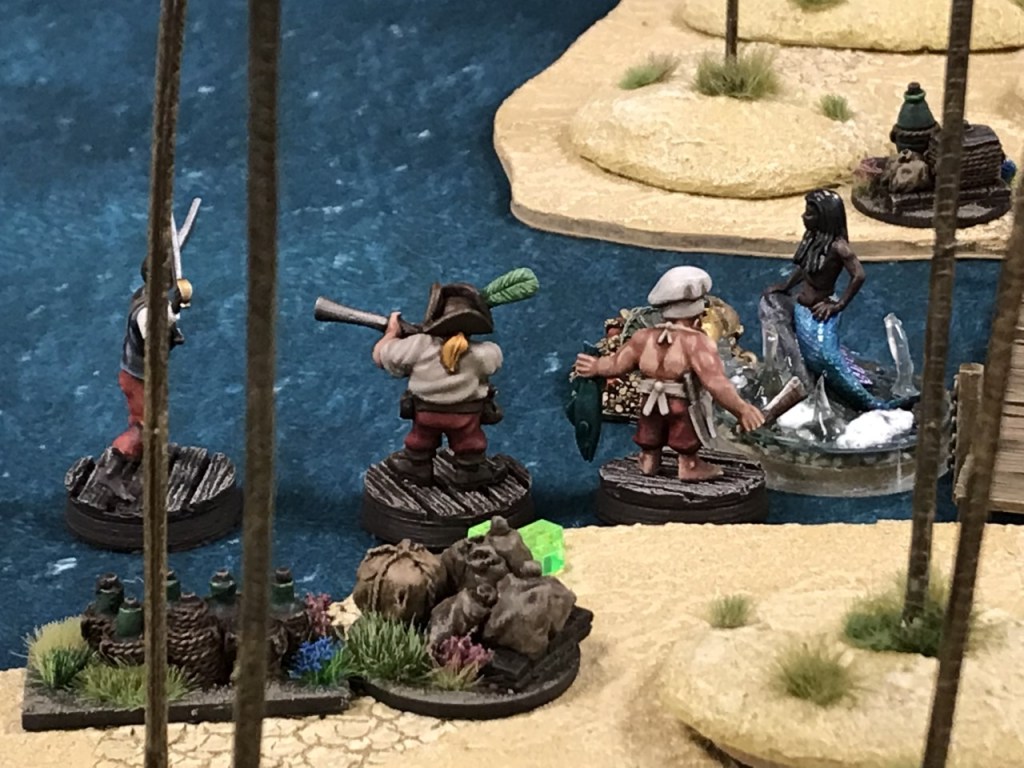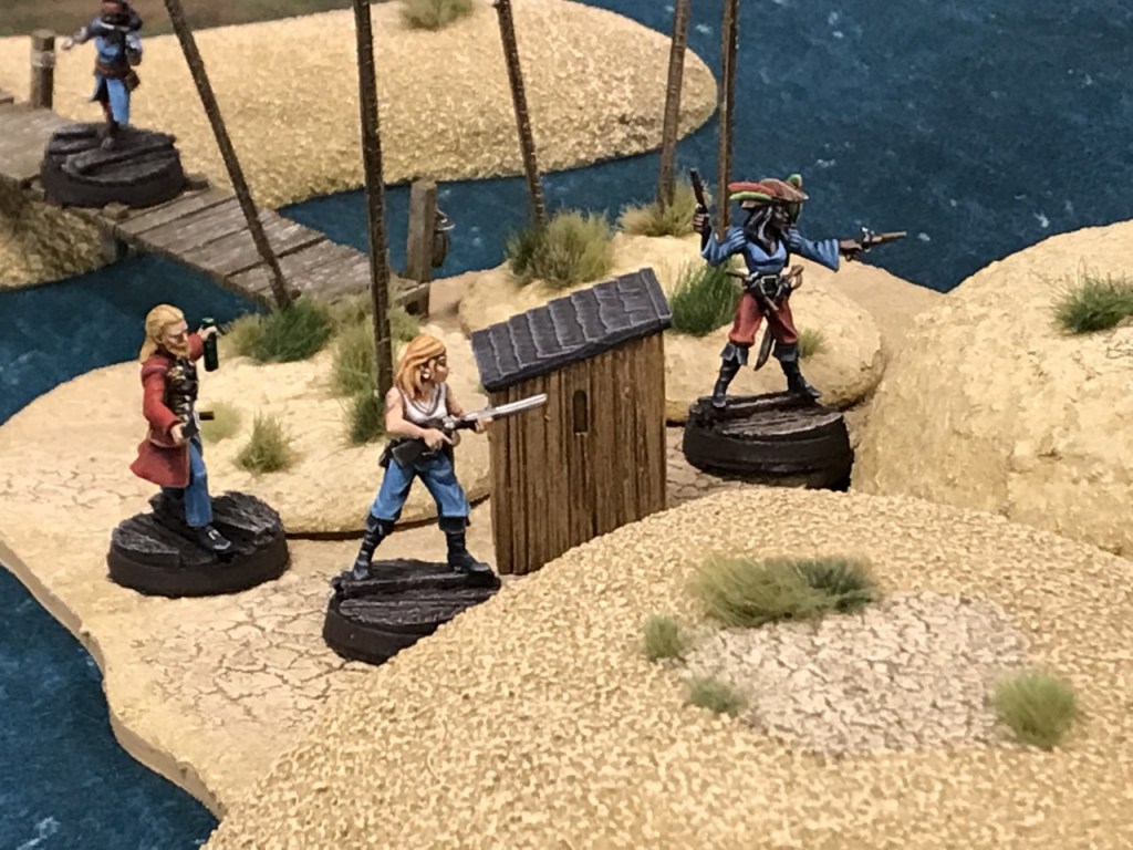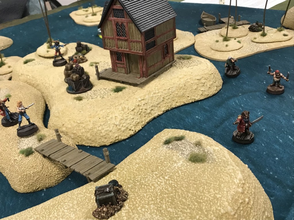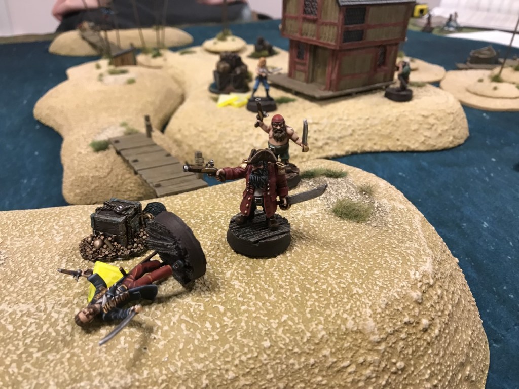 Something else I really liked was the dynamic between shooting and hand to hand combat. The shooting in the human and dwarf warbands is really short range, and black powder weapons need reloading which means characters can’t stand around on the board edge taking pot shots at each other, which in my view is a very unpiratey behaviour. Hand to hand combat seems much more efficient, which encourages movement.