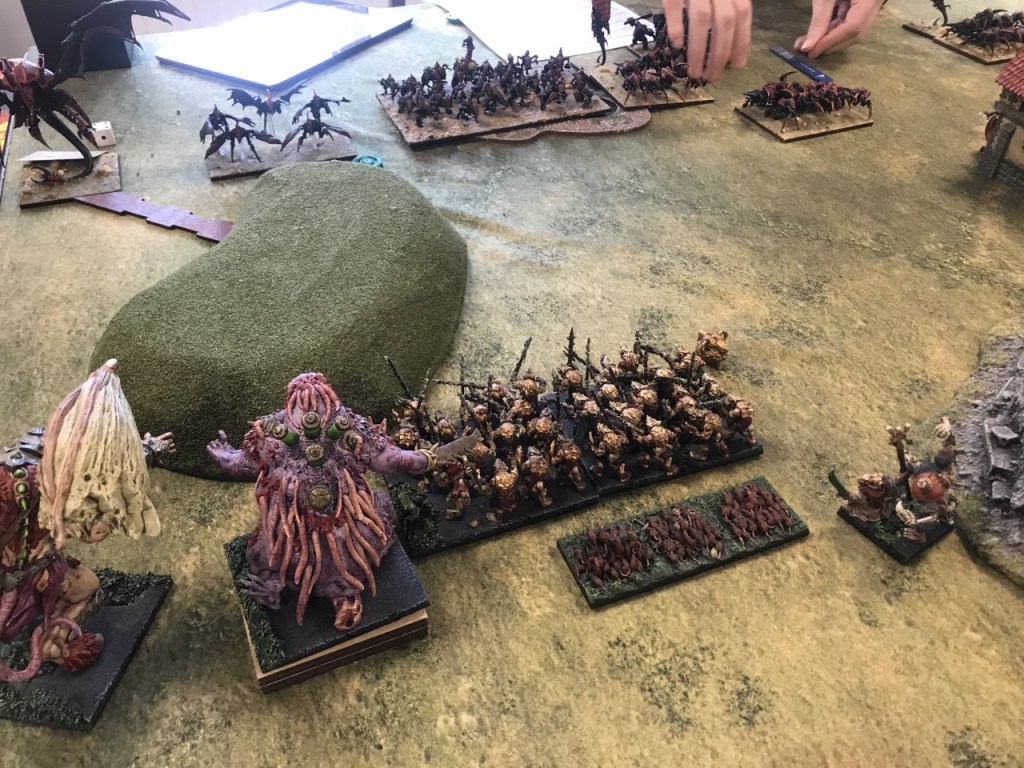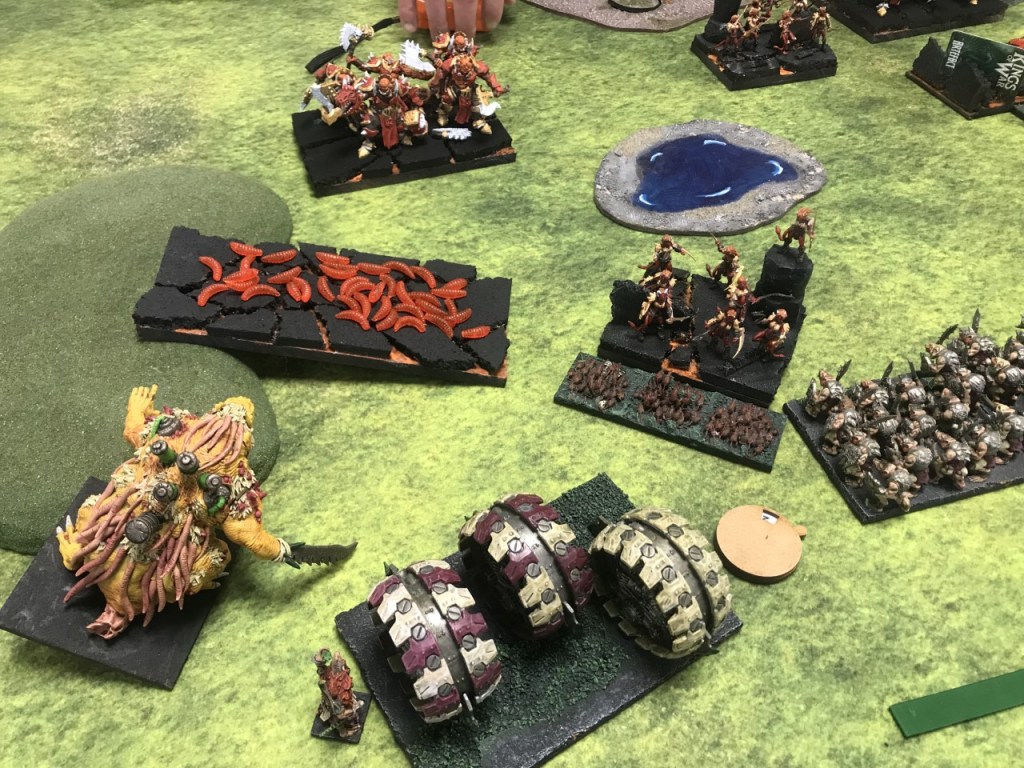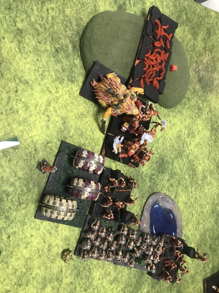 On the left flank things did not go well! I had problems dealing with the second void lurker which cost me Scud, then the blood worm legion (with Brew of Strength) went to town on munching everything that went near it consuming a mutant rat fiend, a horde of shock troop, Mother Cryza and a regiment of vermintide. With the legion and a surviving horde of scarecrows firmly in my half the game was a loss however a near comical showing by my dice in the final turn really didn’t help.