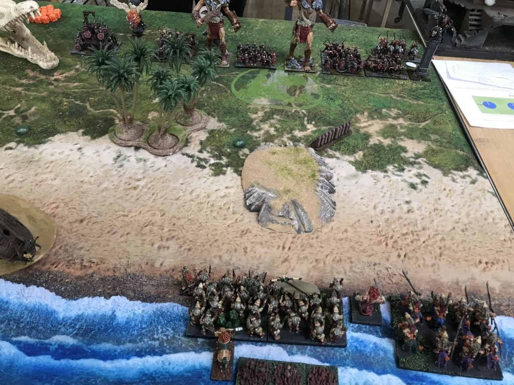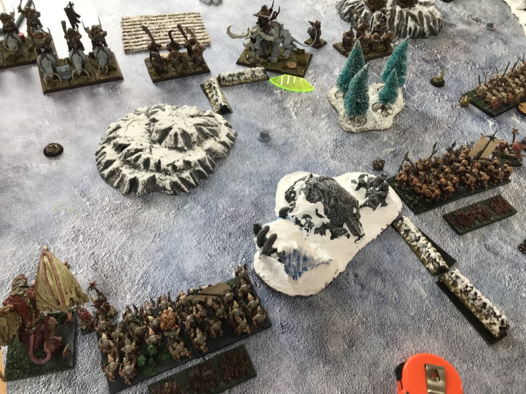 The orcs brought The Iron Boots Formation (three regiments of Rift Forged Orcs with extra nerve), two Storm Giants, a Fight Wagon Legion, Thonaar, a Stormbringer and a horde of Thunderseers. Rift Forged Orcs are a surprisingly resilient army, despite not having any healing or rallying. This makes their Storm Giants particularly problematic with their Cloak of Death and then there’s Thonaar, who is arguably the most annoying individual in the game.