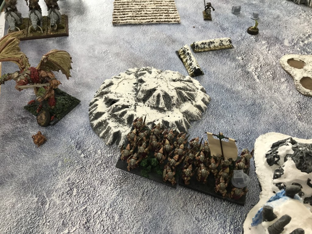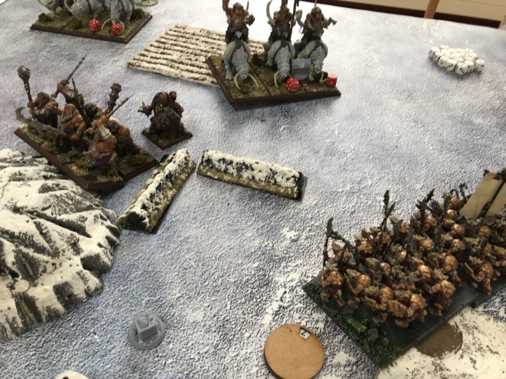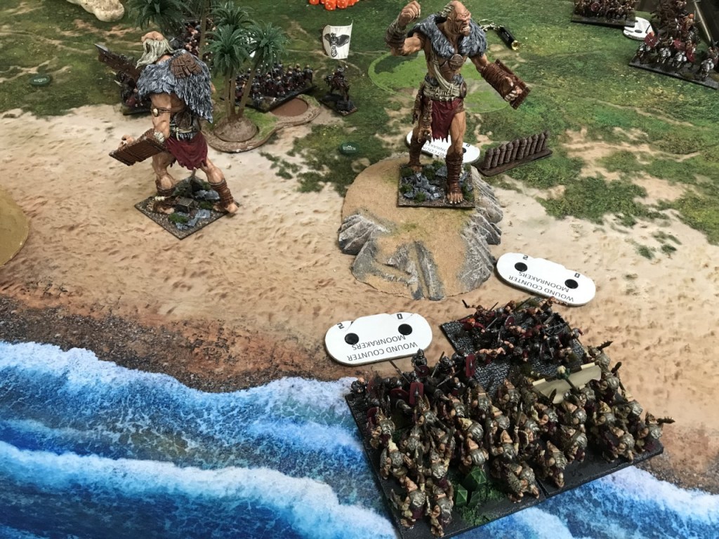 I will admit to my first massive error of judgement of the day. I forgot that the objective in the centre was an objective and not a dominate circle. Consequently, by the end of turn five things were not in the best place. My gamble on the right flank had paid off and a lone Giant made its way towards the centre.