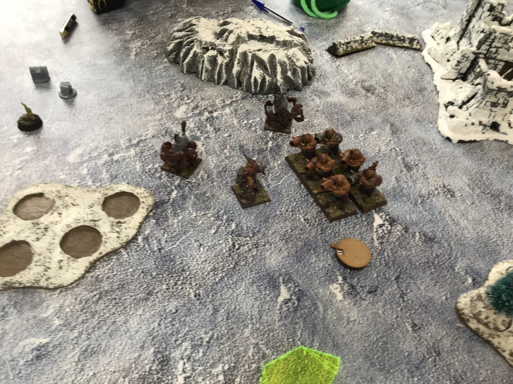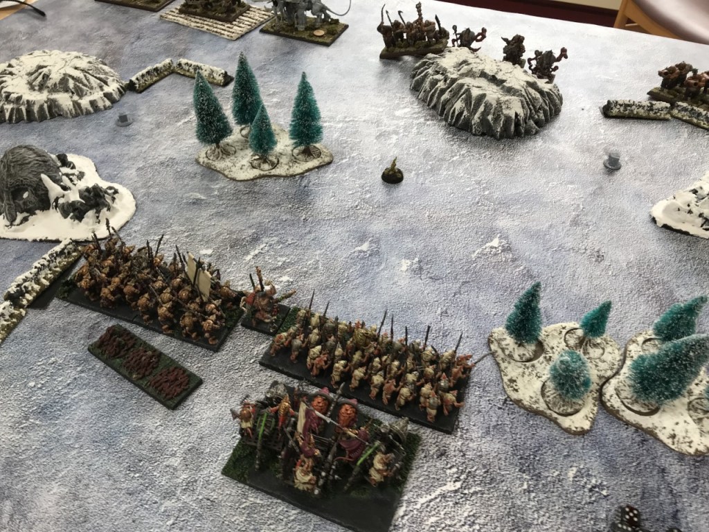 I placed the majority of my army on the left and in the centre, with the Warlocks and Scud on the far left. Although there was a large chunk of impassable terrain in the middle of my deployment there was a fair amount of other terrain that would slow the ogres down and take the sting out of their shooting. On the far right I placed my Hackpaws and the Brute Enforcer who found themselves opposite a Bully and a mounted Goblin King with a short bow.