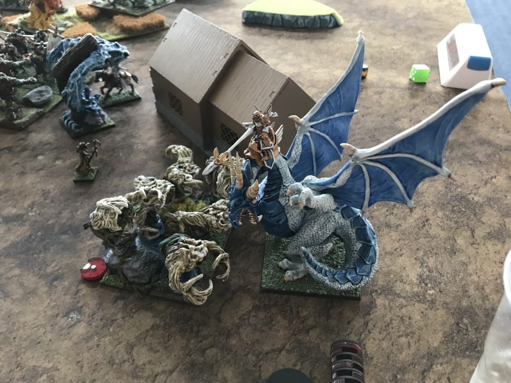 The dragons swept down the flanks and distracted the units on the edge of nature’s tightly packed ranks. On my left air elementals went dragon hunting, but thanks to a well-placed house they were unable to charge me. On the right the hydra and a horde of water elementals responded.