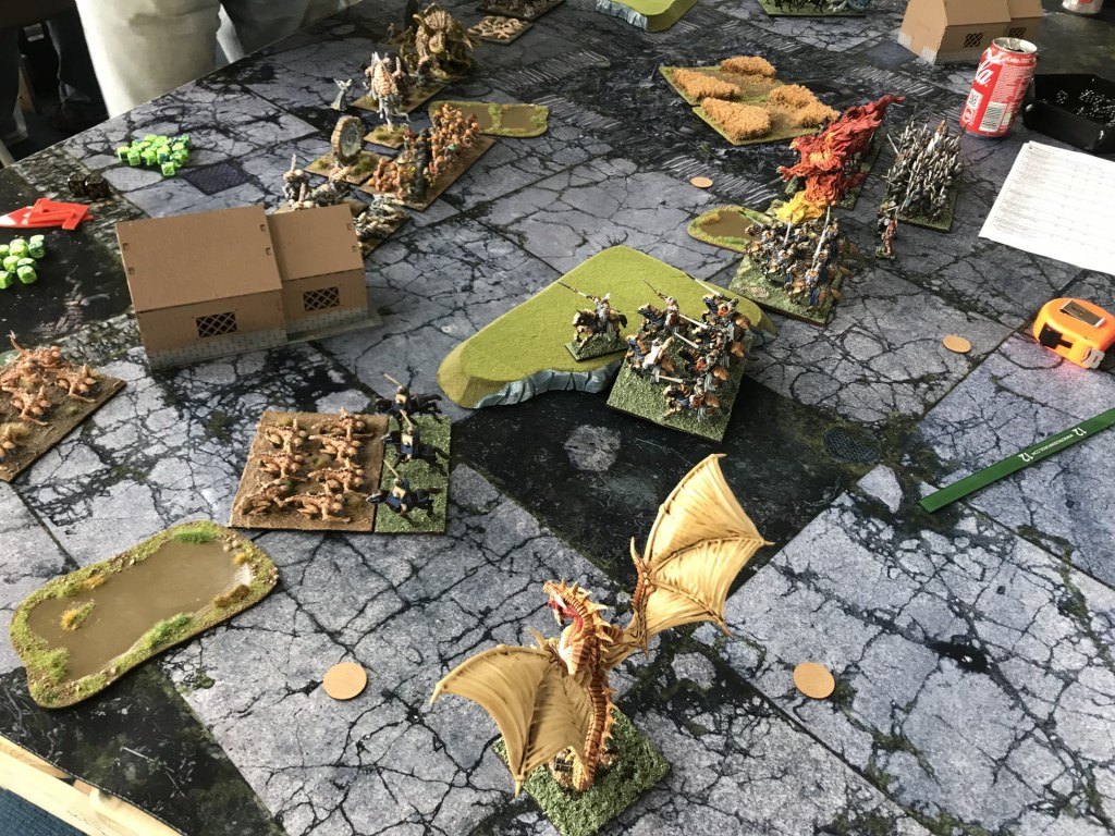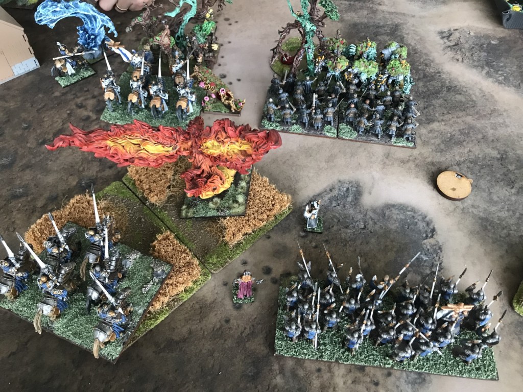 The Phoenix charged the tree herder in the fourth turn and the two remained locked together in a futile fight for the remainder of the game, meanwhile the dragons broke the flanks before struggling against a greater water elemental and a horde of earth elements. As the Brothermark’s titans deadlocked against their opponents the rest of the army spread out to claim objectives. In the final round the druids surged the greater water elemental into my central scoring zone claiming 2 points, however the knightly order took the day claiming 4 points worth of areas.