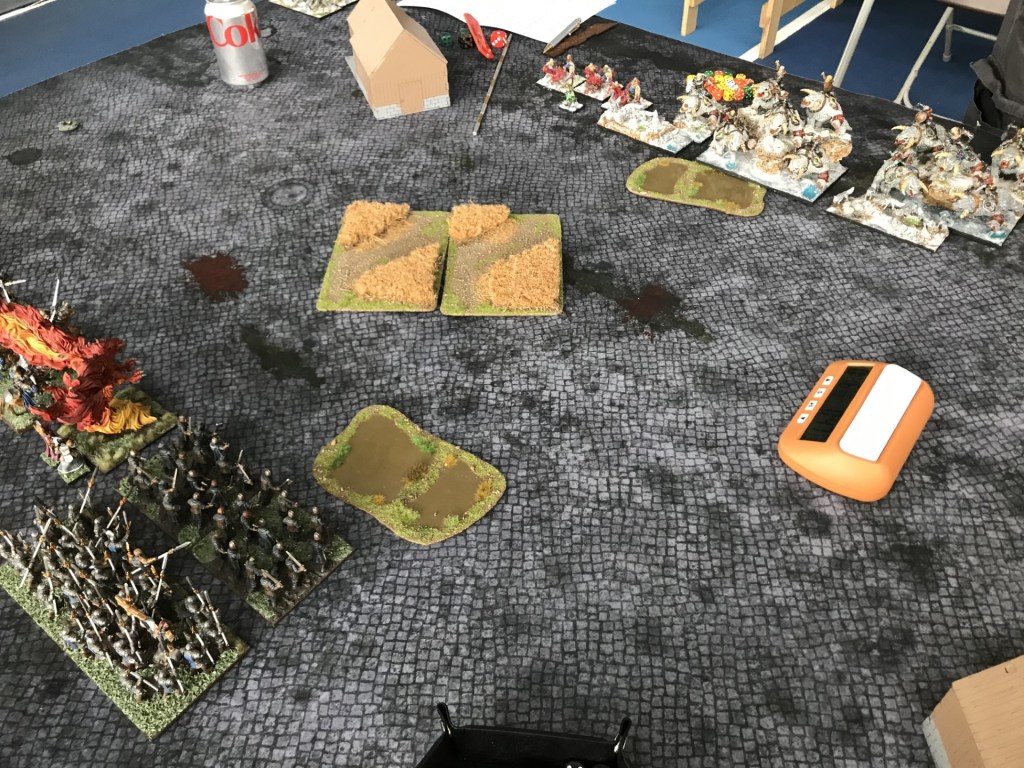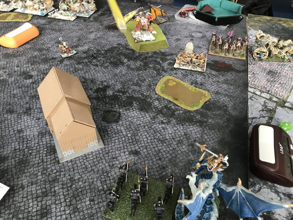 Our little corner of that world was well run by Clive, with some great prize support as it was a Mantic run event. Frankly I couldn’t have wanted more for a relaxed day of gaming. The only slight downside was a lack of woods and walls on the gaming tables (and then I only raise this particular issue because I ended up playing a Varangur army twice that included three Magus Conclaves, a Chimera and mage on a horse with Alchemist Curse). That being said the TO did find some woods for all the tables for the final game (just how much that helped me is questionable, but that’s undoubtedly a me thing).