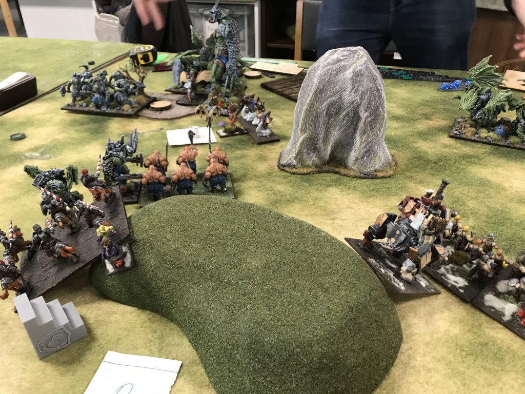 The one bit of respite I had on the right flank was that Thonar became embroiled in a combat with another muster captain which distracted him from the rest of the table. The halflings put up a brave struggle managing to take down the manticores that had destroyed the aeronauts, but they just weren’t able to kill the orcs quickly enough. As right flank collapsed, and the centre started to fall apart the trolls that had been on the right flank made their way back to the loot counter they had been eyeing up at the start of the game. By the end of the game they had managed to secure the loot and save the halfings from a zero point loss to start the day.