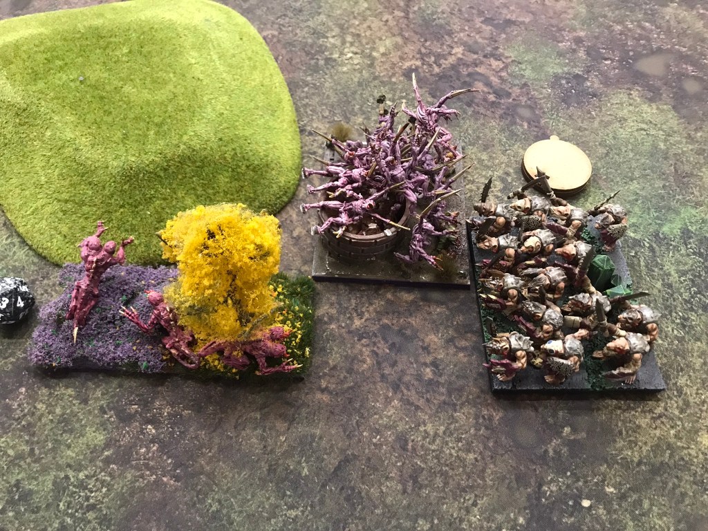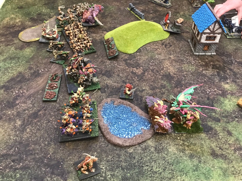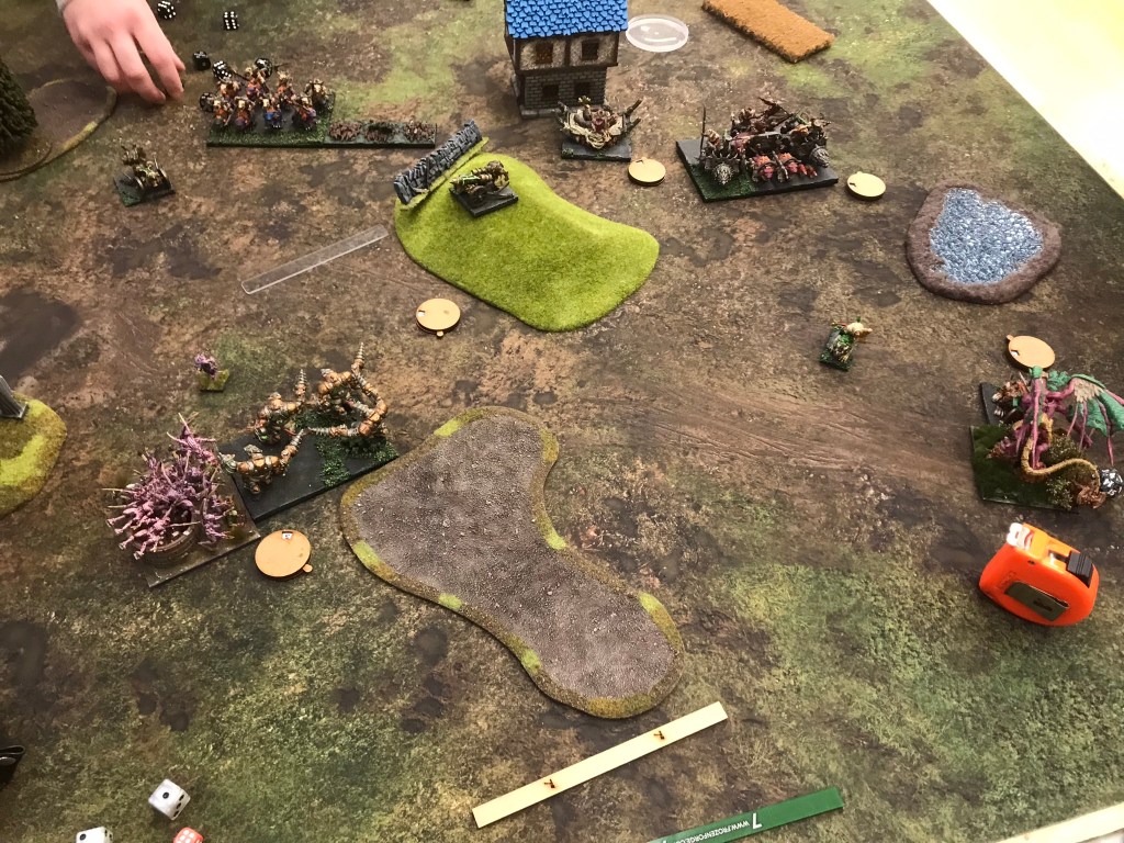 Dabbling a little with halflings myself I knew this would be a fun game. There was quite a bit of brutal in this army, so I really wanted to maximise my rallying and avoid multi-charges of any type. Thankfully our table had quite a bit of terrain in the centre which meant the hordes of stalwarts and the Iron Beast would be slowed down quite considerably.