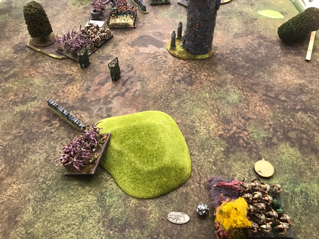 Once we put objectives down and had chosen sides, I decided to take a similar approach to the previous game. This time though on different sides. This was because there was an objective behind a small wood on the right in my deployment zone. I put a warrior regiment here as I knew it would force my opponent to put some resource into winning the token, or he would have to concede it. Happily, he decided to use his mounted paladins with the wine of elvenkind to liberate the objective which essentially took them out of the game.