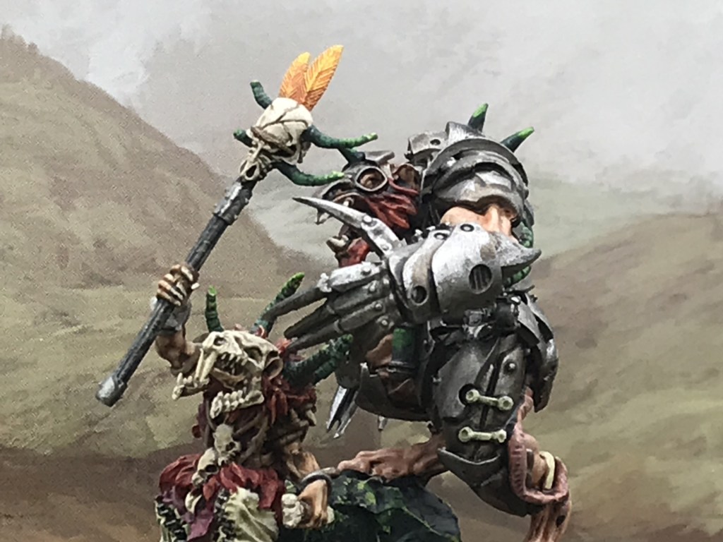 A couple of thoughts then jumped to mind. I was looking at a number of individuals I’ve painted up. The Mantic resins are beautiful, but rarely make it into my army lists. There is an awesome warlock model wearing a skull for a helmet. In the last narrative I wrote for the clan the new leader wears the old leader’s skull as a sign of dominance and queenship, what a fabulous coincidence. The second jolt of inspiration came from my current proxy for Mother Cryza, the old GW Thanquol and Boneripper. As a new leader, the former Birthing Daughter is likely to feel exposed, and so why wouldn’t she find the biggest brute and make him her bodyguard. I’m really looking forward to getting her on the table.