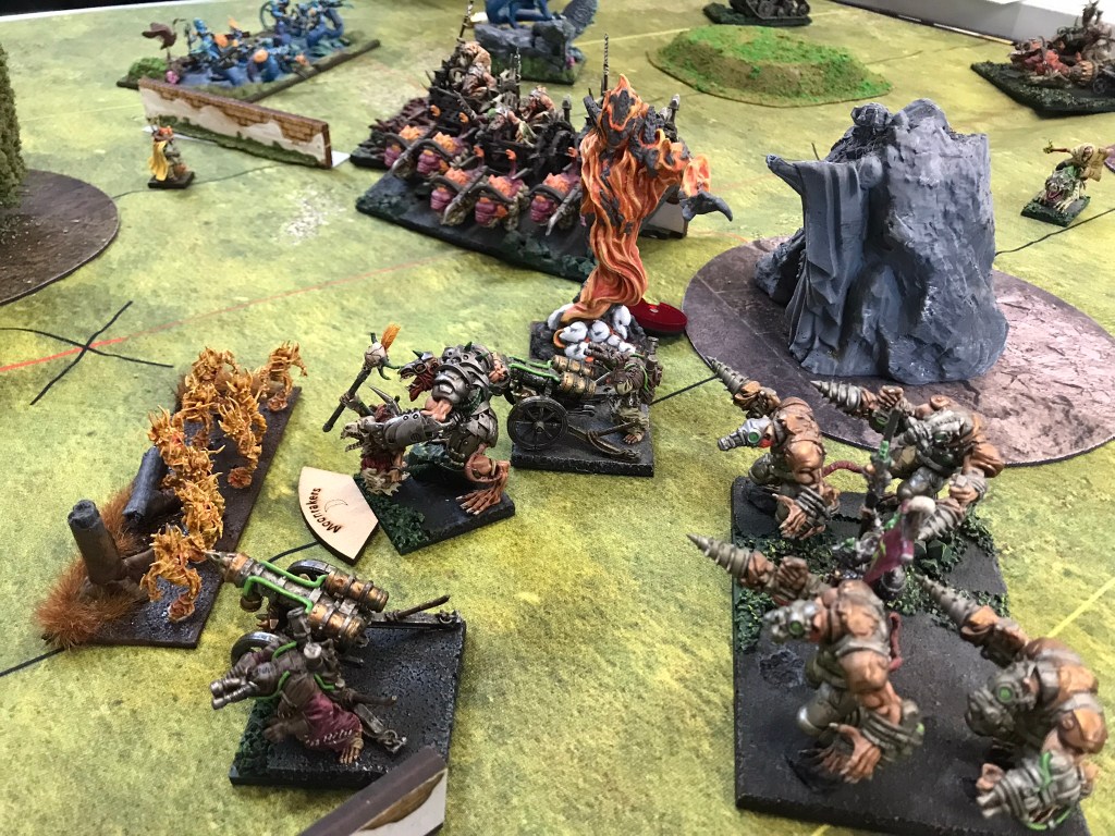 The emphasis of this scenario, for both me and my opponent came down to keeping our characters alive and getting them to the other side of the board. To that end we focused our forces at either ends of the table. My heavy hitters mustered on my right-hand side of the table, whilst my opponent had the bulk of their forces on my left, with what could best be described as token forces attempting to slow down and kill off the characters. In both cases our defending forces could do little to really break the onslaught charging towards them. On my left flank a horde of wretches, the shock troops, a brute enforcer and a regiment vermintide failed to make a particularly impressive stand against forest shamblers, the Wilt Father, air elements, and a whole host of other environmental nasties. Whilst on my right the tunnel runners and shooters easily cut through the resistance offered by fire elements, a hydra and a horde of naiads. There was a moment of high drama when I accidentally left my special character open to a charge from the naiad horde, but fortunately a spectacularly bad set of dice results left the character with only one point of damage. The sharpness tunnel runner regiment then had a flank charge on the naiad horde, which subsequently disappeared.