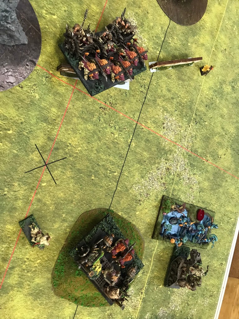 In the first turn my night terror shot forward and secured the loot counter on my left flank whilst the remainder of the army hung back, ready to charge in if any of the dwarfs decided to charge into the wee beastie. In response the dwarfs moved forward trying to close the gaps between them and the counters without breaking ranks and offering potentially favourable charges to my toughest units.