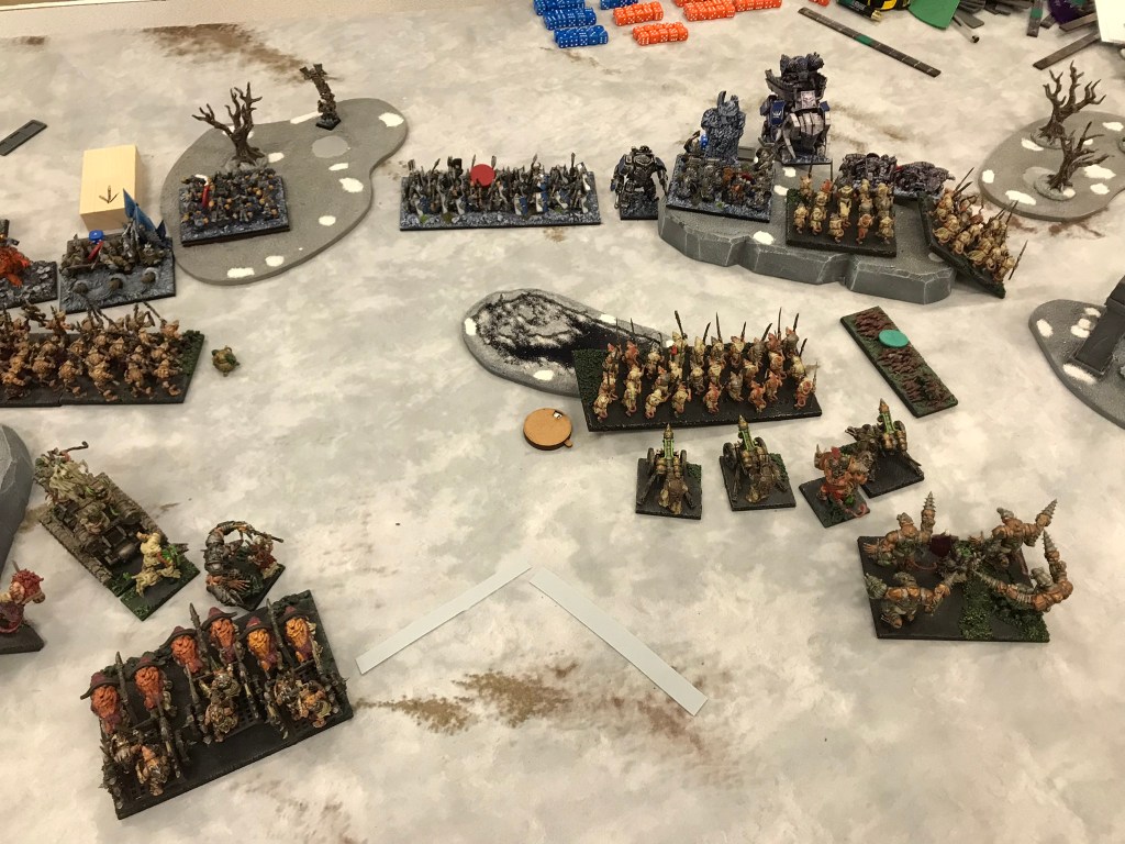 We had set up so we had similar capabilities opposite each other. On my left flank I had my tunnel runners, night terror and shock troops, opposite his beast mounted lords and infantry. In the centre I had focused my shooting units with the wretch hordes, against Goloch’s Fury and the iron guard.