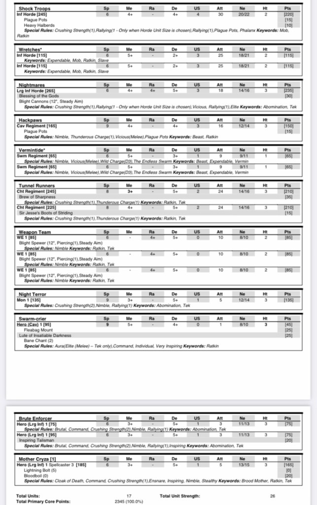 As I planned my list for the 2345 point event the first question I had to answer was whether Scud was coming out to play? After a bit of reflection, I decided to leave him at home as I wanted to maximise the number of drops I could put on the table, and I liked the idea of trying to swamp the opponent with a bit more trash than usual. I also felt the lists I played later in the year suffered for trying to include too many expensive unit choices that lacked reliable damage output because they still only hit on 4s over cheaper trash.