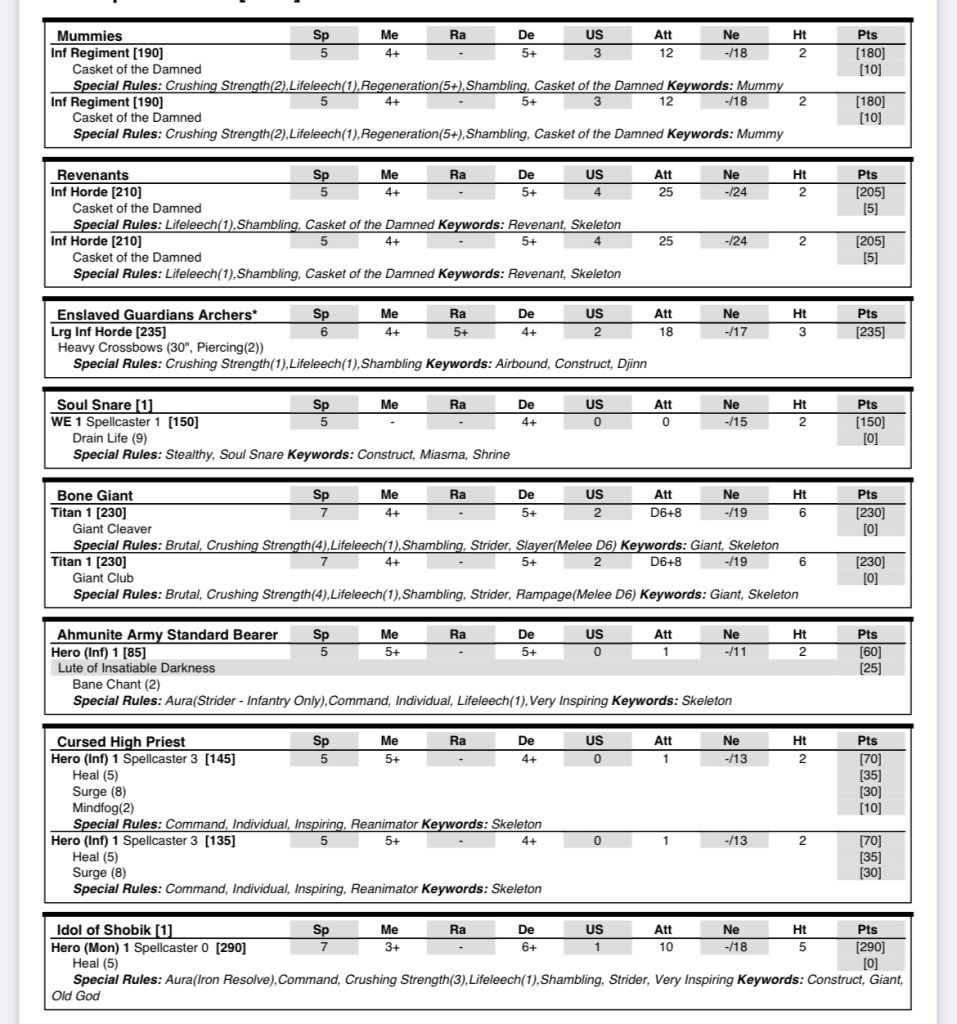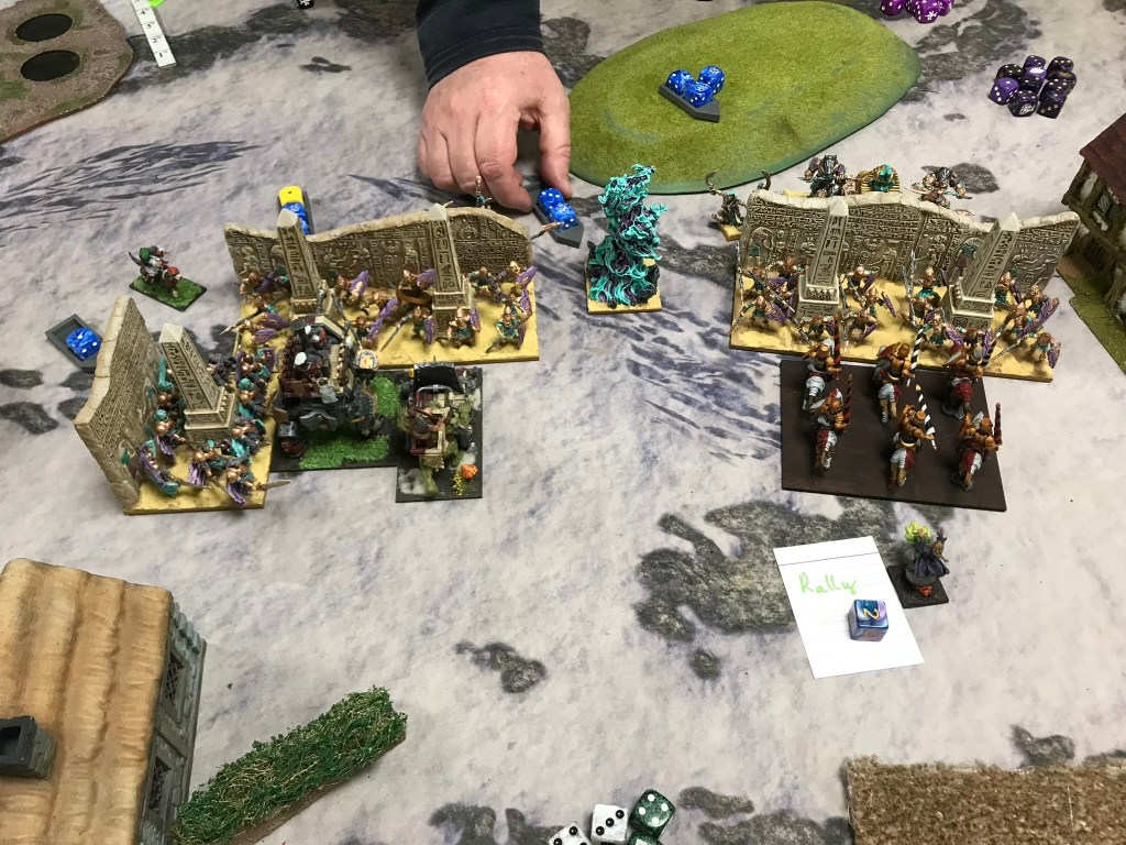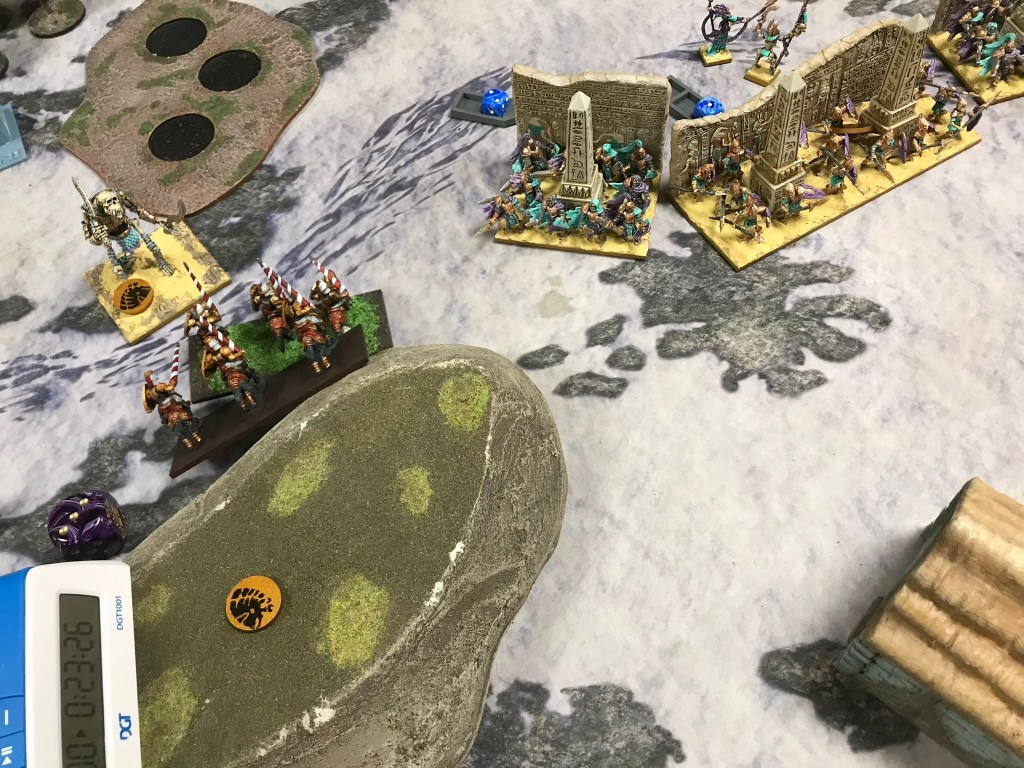 Heath’s list was massively intimidating on the table. A solid line of high defence and nerve with loads of healing. What I tend to find with games against Empire of Dust is they tend to go one of two ways. Either you manage to smash through a couple of key stone units at either end of the line and roll up into the middle for a solid win, or you bounce off them in the first couple of turns and then they grind you down.