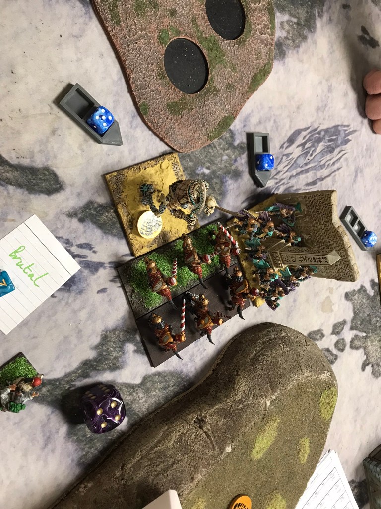 Going into the event I’d accepted a challenge from Heath, who was bringing Empire of Dust, and I had a lot of feelings about the game. As someone who’s great at picking armies that don’t really pack much of a punch Empire of Dust is always a bit of a tough match up. However, my list for this event includes a Jugger horde with the Brew of Strength, which I was hoping would make life a little easier in this match up.