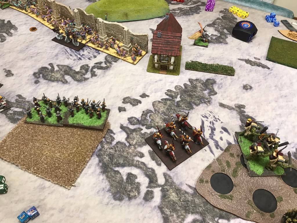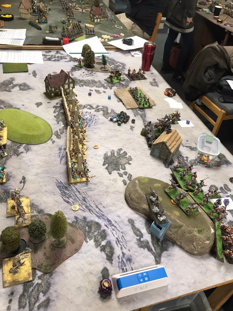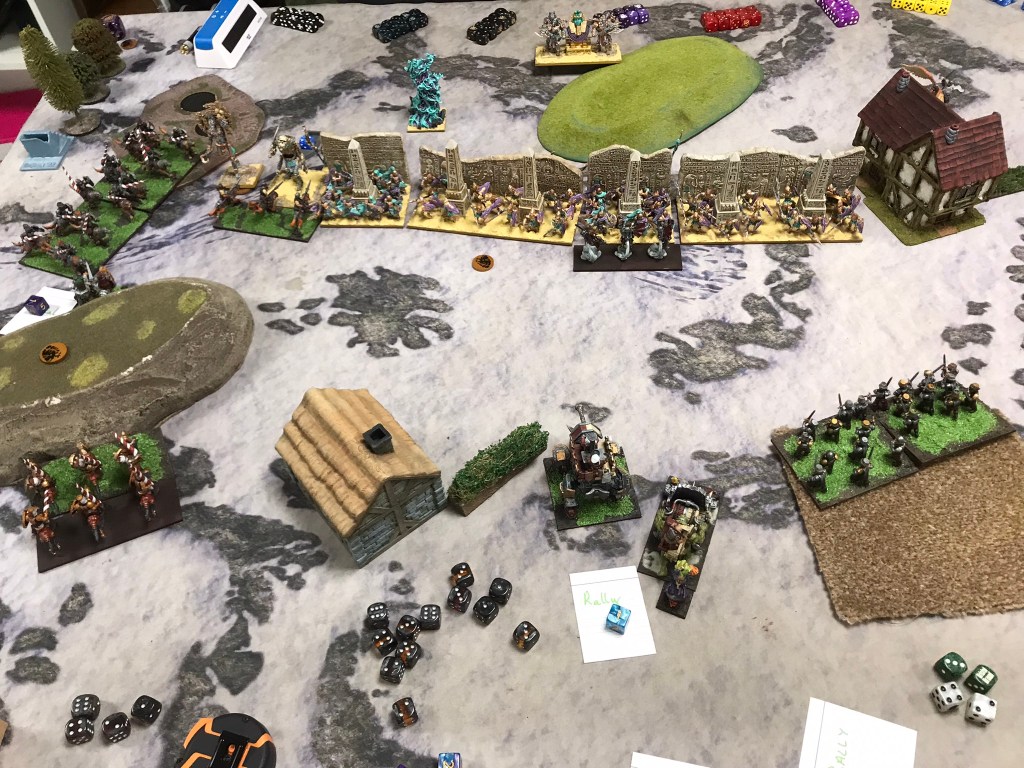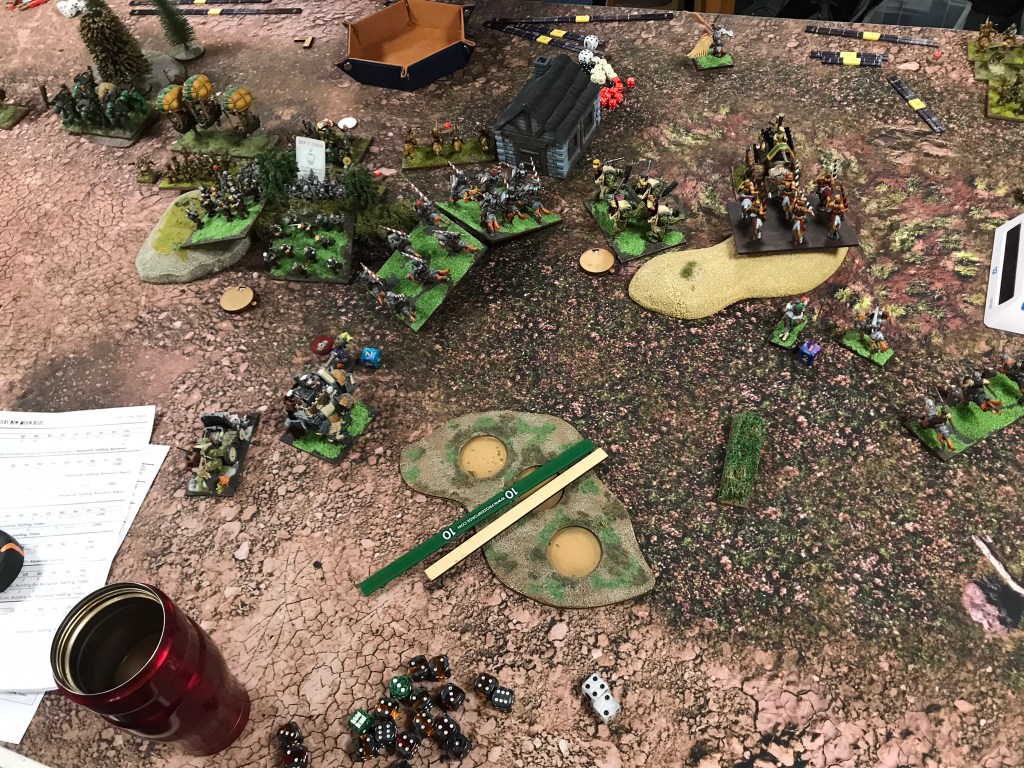 In turn 2 the charges began. Whilst the Stalwarts blocked up the centre by rushing their opposite numbers, the horde removed the poachers they’d had their eyes on, and the trolls took off the Wild Runners with the Iron Beast. However, the momentum got lost very quickly as the enemy Halflings started to bog down my key units. With quite a few units in the centre there was plenty of low value units to throw at my horde. On the right though the Iron Beast just wouldn’t die. Despite taking two rounds of flank charges from the trolls nothing seemed to be able to bring the mechanism down. By the time my Halflings had killed it, there was not enough time to get the cavalry around a house that blocked their most direct path to the furthest centre objective.