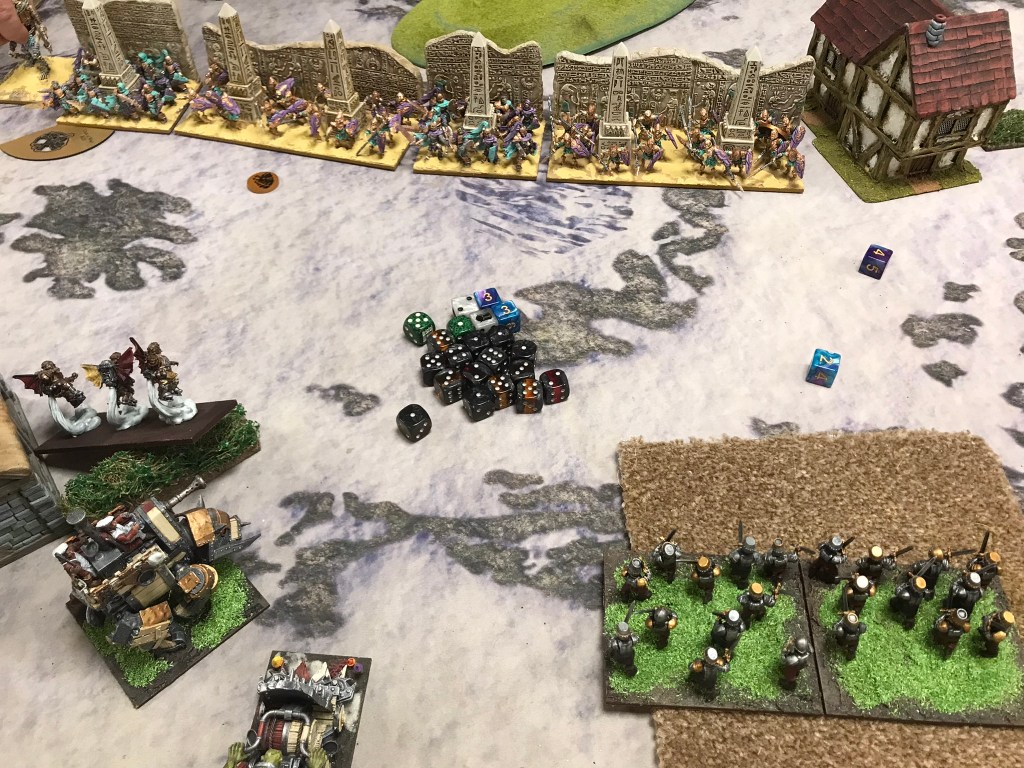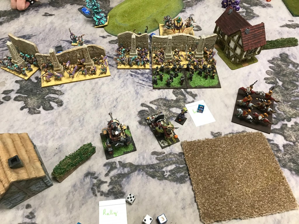 With great in roads being made on the flanks I prepared to break the centre. An over enthusiastic over run from a Mummy regiment left it open to a multi charge from the Iron Beast, the Harvester and unhindered Juggers in the flank. Now all I needed to do was breakthrough the horde of Revenants that anchored the EoD line in the centre of the board. With a rear charge from the Muster Captain on Winged Aralez, a Stalwart horde in the front and some brutal from one of the Saucerors I had high hopes! But it was not to be. The Revenants weren’t going anywhere and over the next few turns the combat would wipe out the Stalwarts, the Captain and a Jugger regiment. Unable to break the centre, and with the momentum from the right flank falling away the Halflings found themselves running from the field, although there was a moment of celebration to be had that they had escaped with two loot counters, but they weren’t enough for the win.