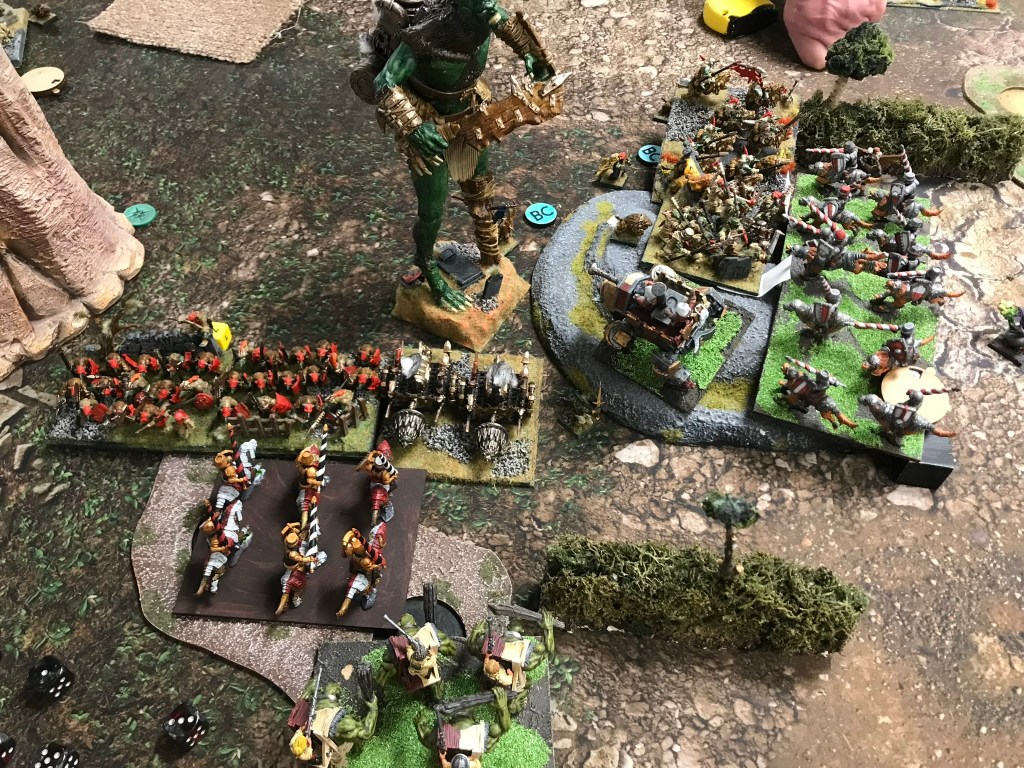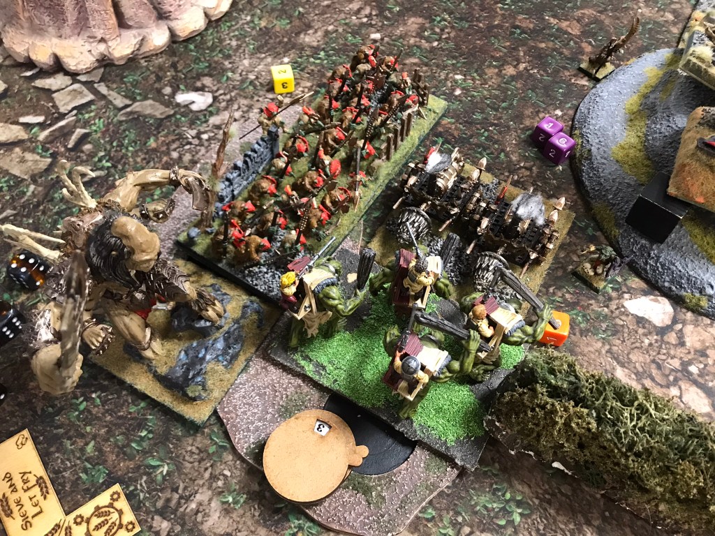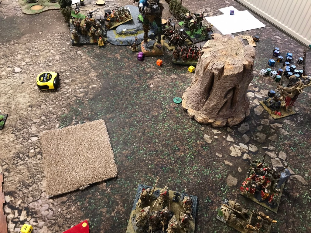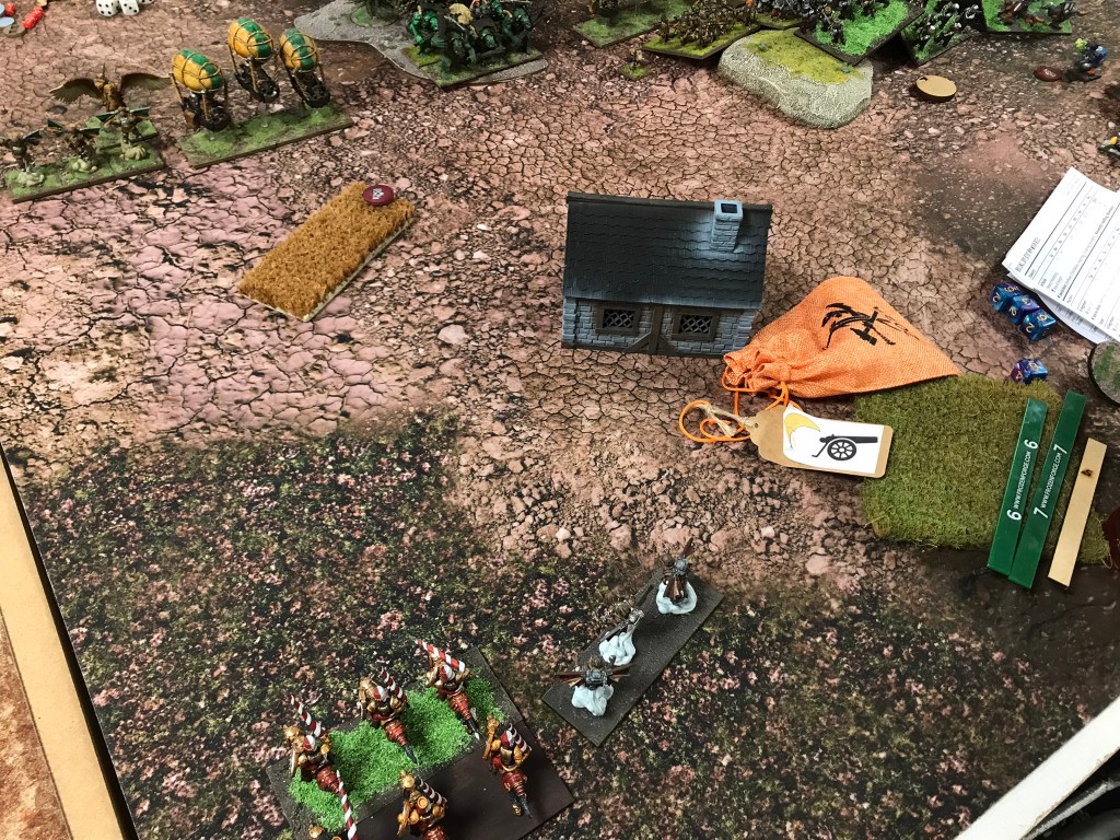 Despite the breaking of the horde the Halflings where still strong enough to hold onto the scoring zone on the left for turns 3, 4 and 5. What I loved most about this game though was that whilst there was quite a brutal trade of units going on in the centre of the board there was a far more intricate game of cat and mouse happening in my opponent’s deployment zone. The flying Muster Captain and a regiment of Ej grenadiers played cat and mouse with Fleabags and the King in the Chariot looking for an opportunity to support the struggle for the centre. Unfortunately, that opportunity didn’t materialise in a meaningful way, and whilst the Halflings easily managed to keep the Goblins out of their scoring zone they didn’t have sufficient strength to push the green mob back from the centre.