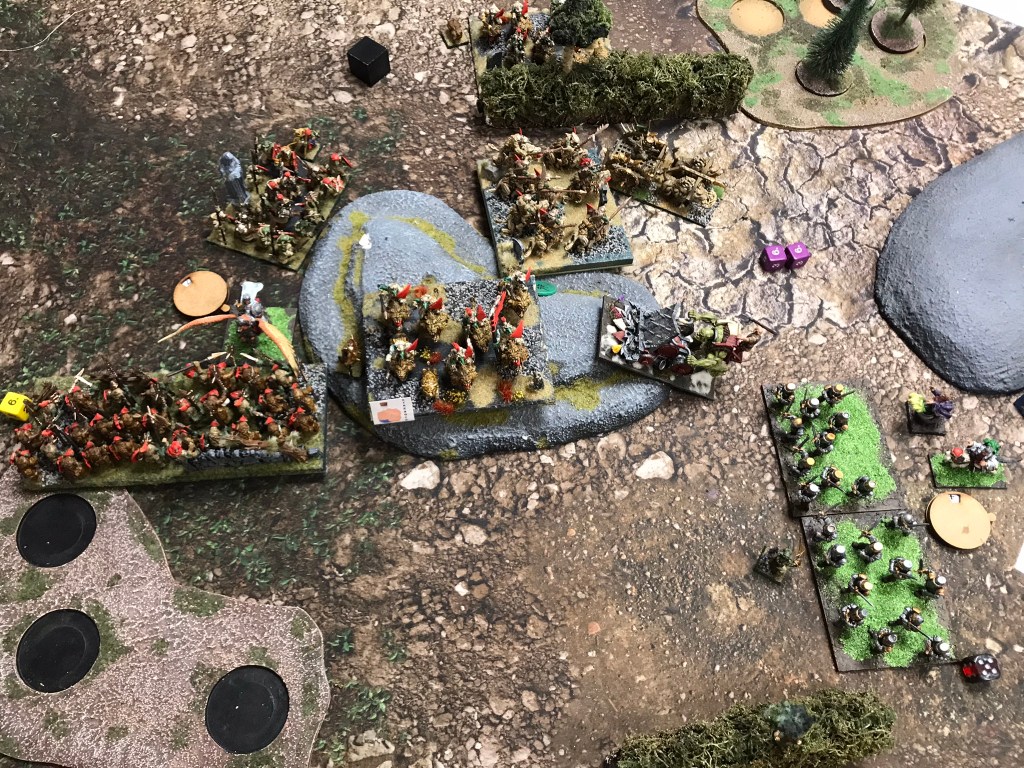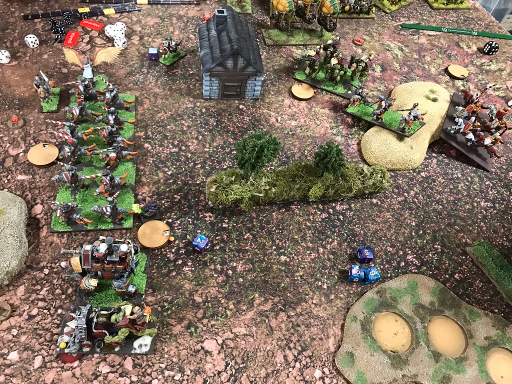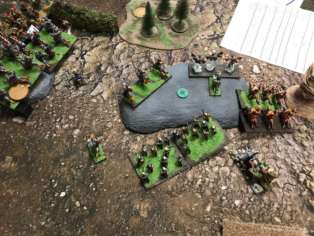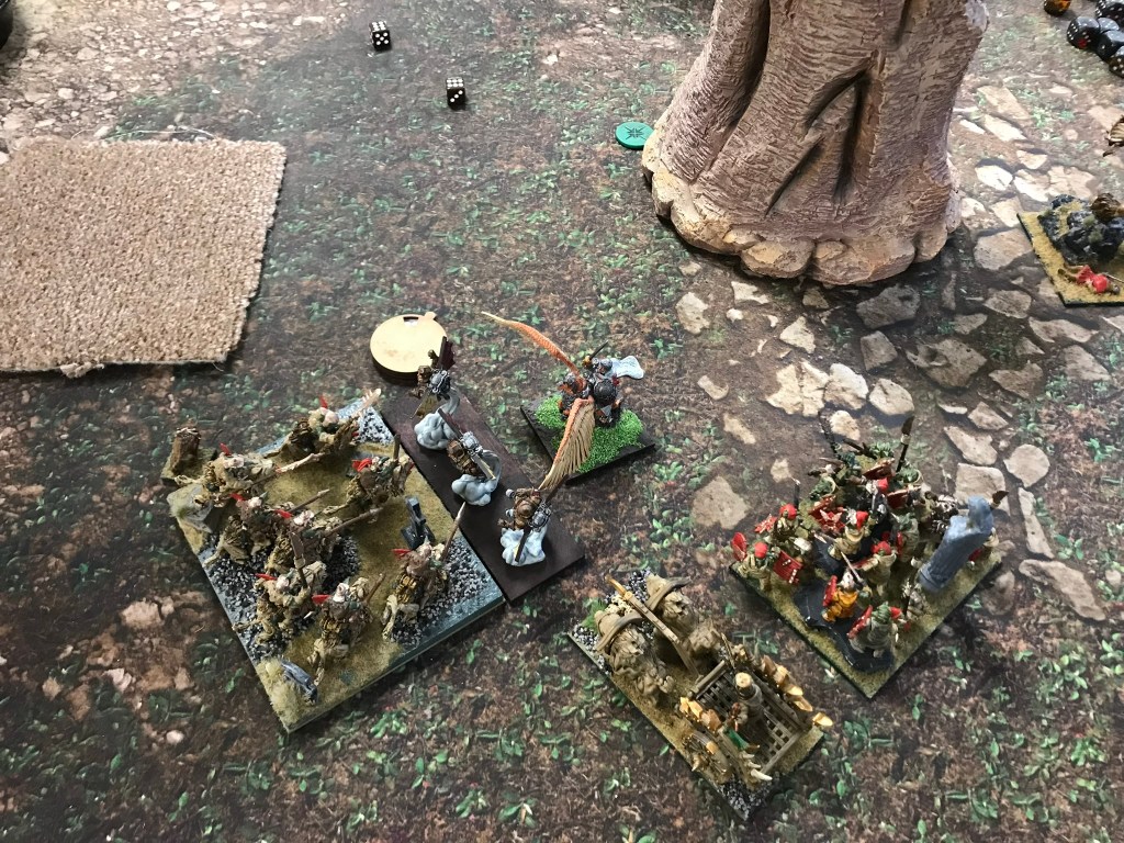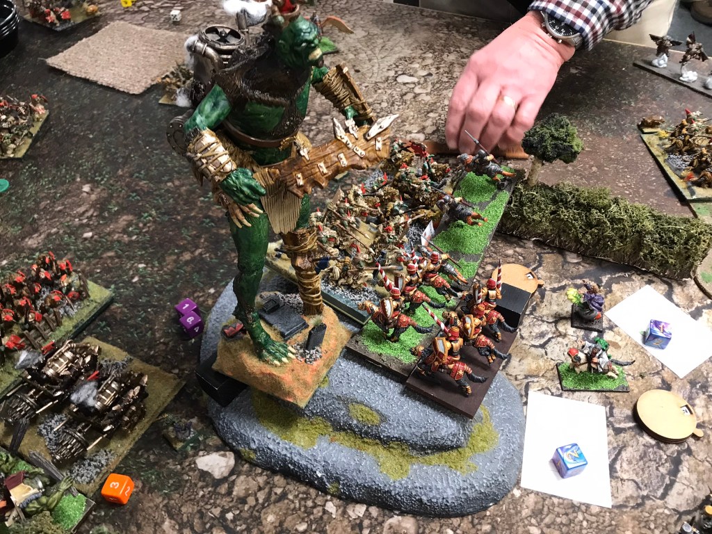 Despite the breaking of the horde the Halflings where still strong enough to hold onto the scoring zone on the left for turns 3, 4 and 5. What I loved most about this game though was that whilst there was quite a brutal trade of units going on in the centre of the board there was a far more intricate game of cat and mouse happening in my opponent’s deployment zone. The flying Muster Captain and a regiment of Ej grenadiers played cat and mouse with Fleabags and the King in the Chariot looking for an opportunity to support the struggle for the centre. Unfortunately, that opportunity didn’t materialise in a meaningful way, and whilst the Halflings easily managed to keep the Goblins out of their scoring zone they didn’t have sufficient strength to push the green mob back from the centre.