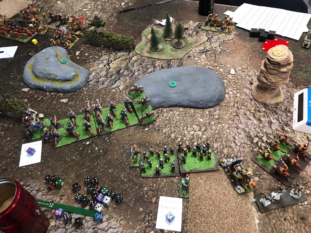 When I set up the loot counters, I did my best to spread them around the table, knowing that the EoD’s strength lay in sticking together to deny flank charges. I was hoping he might send a unit or two off on their own reducing the inevitable wall that would form in the centre. Unfortunately, Heath was not going to fall for that trick and so the game kicked off. On my left flank I had put the Jugger horde, together with a regiment and the Wild Lancers. They started out well, managing to fell a Bone Giant and Shobek. Unfortunately, I messed up the reform allowing the second Bone Giant to get a charge, which could have been avoided, into the horde which took it off the table.