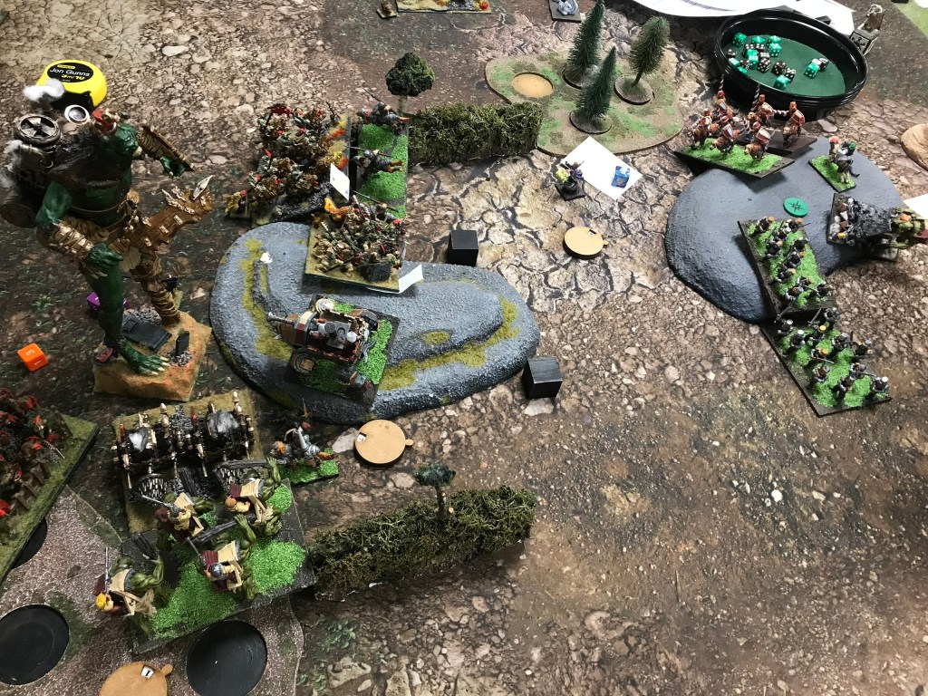 Both armies pushed forward into their respective scoring zones, before turning in towards the centre. With the benefit of hindsight, I realise that I was probably a little too eager to engage with them and foolishly threw both my Iron Beast and Jugger horde into a regiment of goblins that had been pushed ahead of their line. Not surprisingly, the goblin regiment rapidly disappeared from the table however this opened up my Horde to a charge from a hindered Fleabag Regiment, Groany and a unit that I completely forgot was the Luggits. The damage from Groany and the Fleabags was negligible, however the Luggits rolled exceptionally well and the Jugger horde broke.