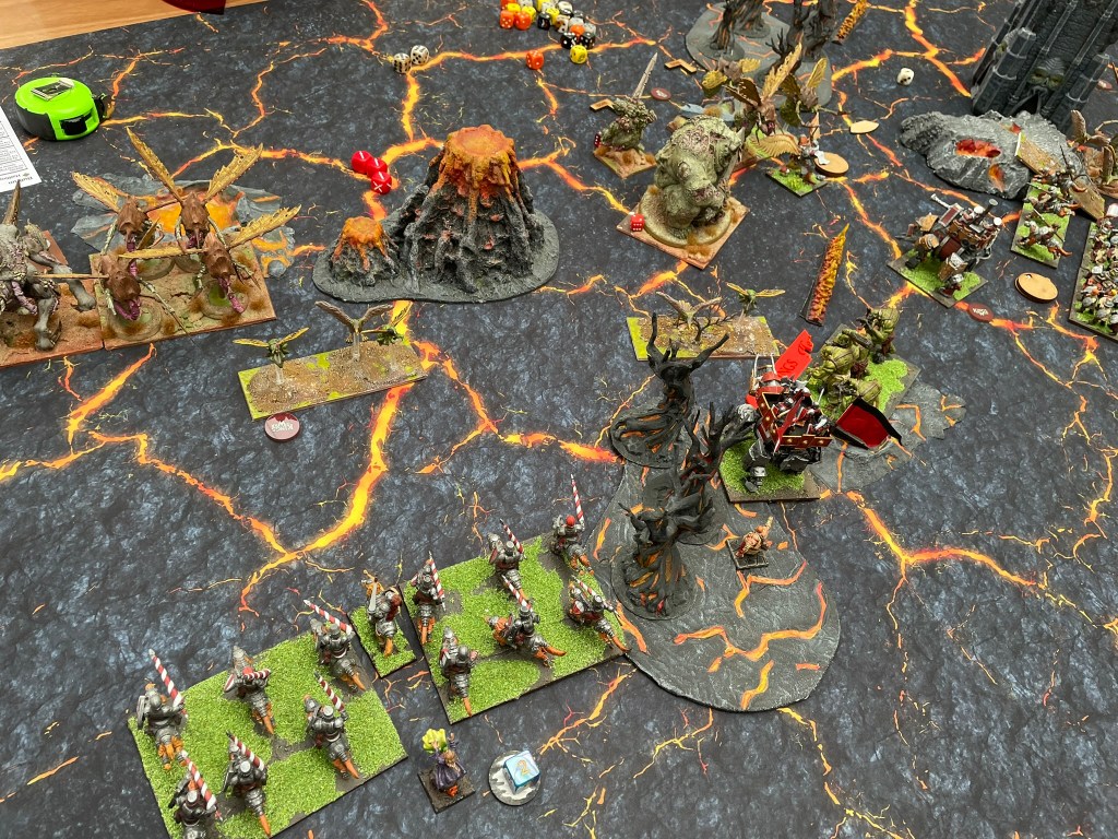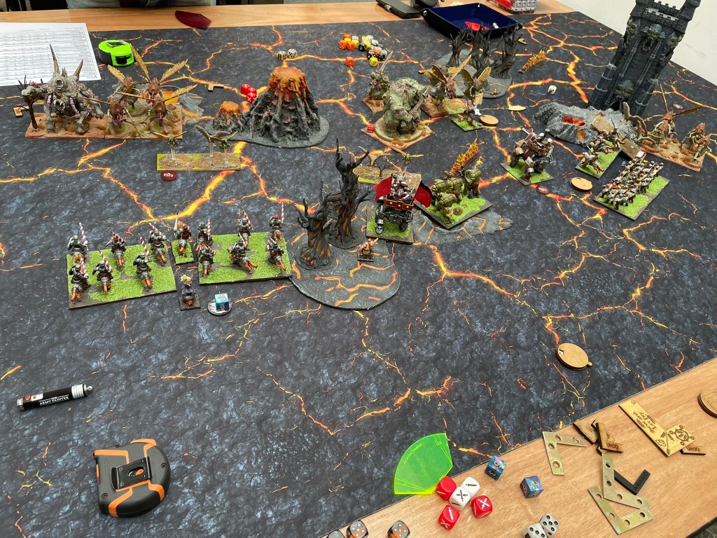 Unfortunately, due to timings I haven’t been able to write up the whole event, so I’m planning on writing the three games up separately over the next few days. Without further ado let’s get into the first game against the Forces of the Abyss. By way of a little help in the photos the Abyssal Horsemen are the large flying bug things and the Berserkers are the single monstrosities on the big bases.
