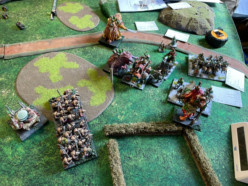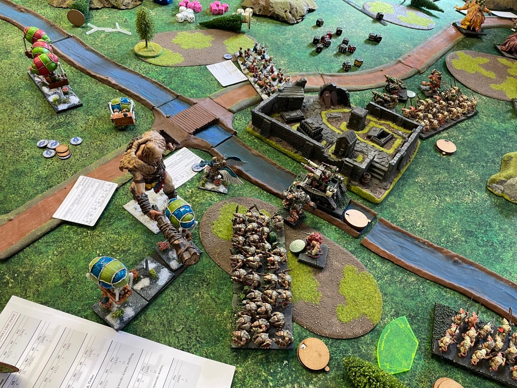 The Stalwarts made a play for the loot in the central forest, charging into the vermintide that had picked it up and wiping them out. Unfortunately, the response from the Ratkin was immediate and deadly. A Brute Enforcer and both the Mutant Rat Fiends charged the heavily armoured Halflings and tore them to shreds, picking up three points worth of loot counters in the process. The spear horde charged the Iron Beast, but failed to wound it, resulting in it becoming the target of a number of very angry people. The spears were surrounded by Ej Grenadiers, the Beast, the Harvester and the Wild Lancers. The Halflings would have their revenge. However, as the Halflings repositioned it became clear that the Ratkin had managed to sneak the loot counters behind their own lines, out of the Halflings’ reach. The Tangle had secured three points, whilst a Brute Enforcer had picked up the counter from the centre. As this happened the infantry hordes and fiends pressed forward, tearing the grenadiers from the sky and dismantling the Pride of the Shires. It was a dark day for the Halflings and a triumph for the vermin.