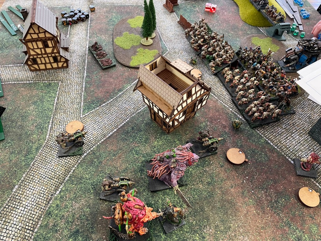 That meant the left would decide the game. The rats slunk around the buildings, towards the enemy lines. The dwarfs held still. In an usually bold move the warriors broke cover and charged, with a spear horde, into the Ironclad horde. I figured that if I could wear it down I might have a chance of holding onto the scoring zone just by weight of numbers. I probably shouldn’t have been surprised that the double charge barely scratched the horde, but it’s really easy, once the game is done, to step back and realise just what you should have done. Despite the failure of the charge, I continued to press my troops, sending the Mutant Rat Fiend into the beast rider, before setting it, together with the giant, on Goloch’s Fury. The dwarf lords fell, but the horde endured, and whilst I had lost my infantry, I still had a solid amount of unit strength floating around on the left side. Unfortunately, it wasn’t in the right place. I’d let myself get carried away and lost focus on the scoring zone. Any thought of a win was dismissed in the seventh turn when the second Bulwarker regiment entered the right flank scoring zone and took if for the Dwarfs.