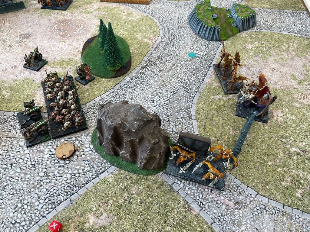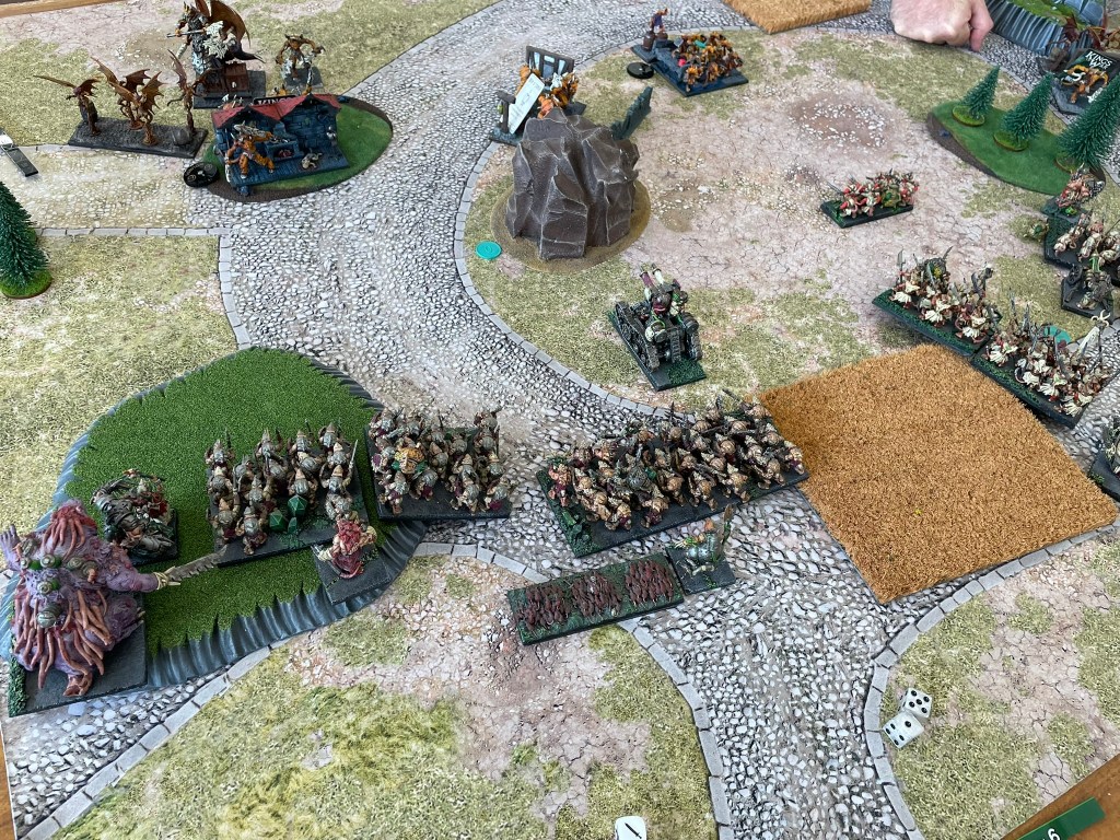 One of the berserker hordes to my right charged my spears, where a brute had been positioned to prevent a double charge against the rat warriors. As the demons went in the other horde broke off and headed around the rock with the arch fiend in support. I braced myself for impact. The slaughter just didn’t materialise. Not only did the beserkers fail to rout the spears, but their fight back, together with the brute that was now in the demon’s flank, quickly took the unit out of action. To make matters worse the war engine teams, and the Tangle converged on the creatures sneaking around the rock and reduced them to a stickly mess. Only the archfiend remained, and a failed attempt to destroy the Tangle left him at the mercy of the guns.