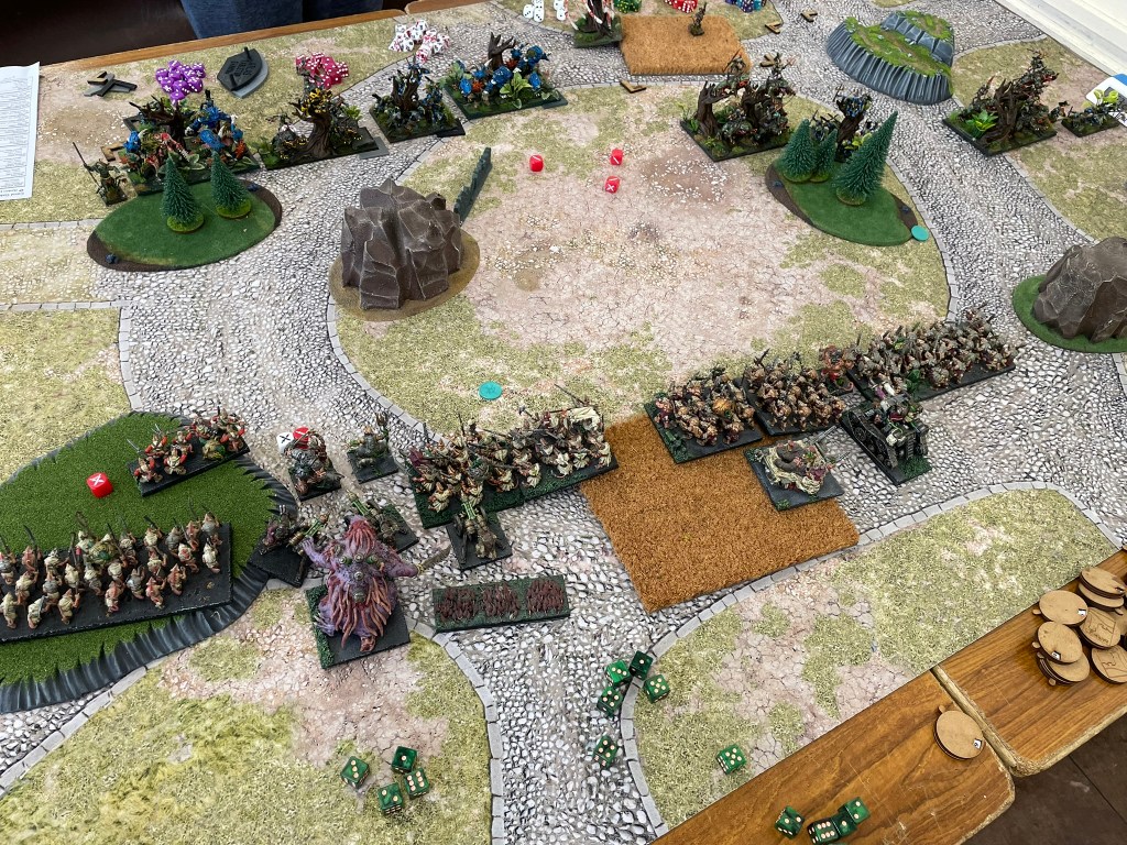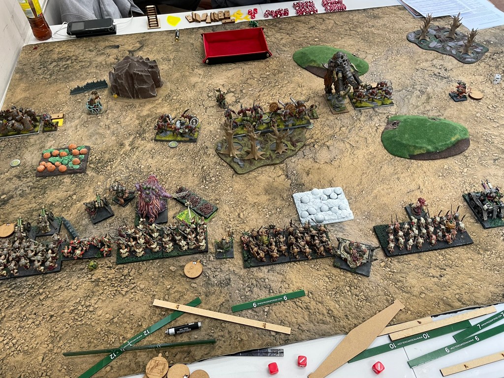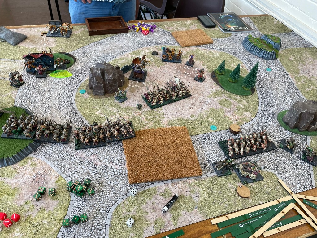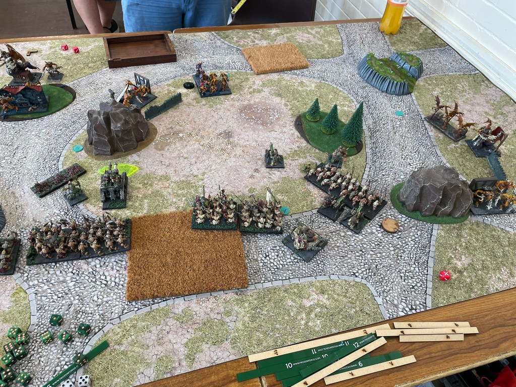Command dice have become a pretty interesting proposition for me at this point. Based on the games I had in Gloucester, I don’t think everyone agrees. I play three factions reasonably regularly which all have a faction specific ability that gives them access to +1 thunderous charge. Over the few command dice games I’ve had I’ve quickly realised just how useful being able to add this is to a unit anywhere on the table is. As a result of this I always make sure to spend 20 points on a white dice which means most turns I will get the requisite 4 points required, but freeing up the points for this meant having to play around with the horde heavy list I took to the last event.