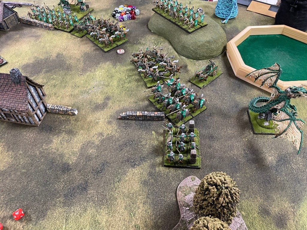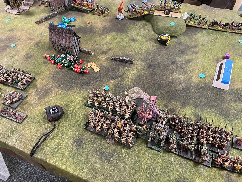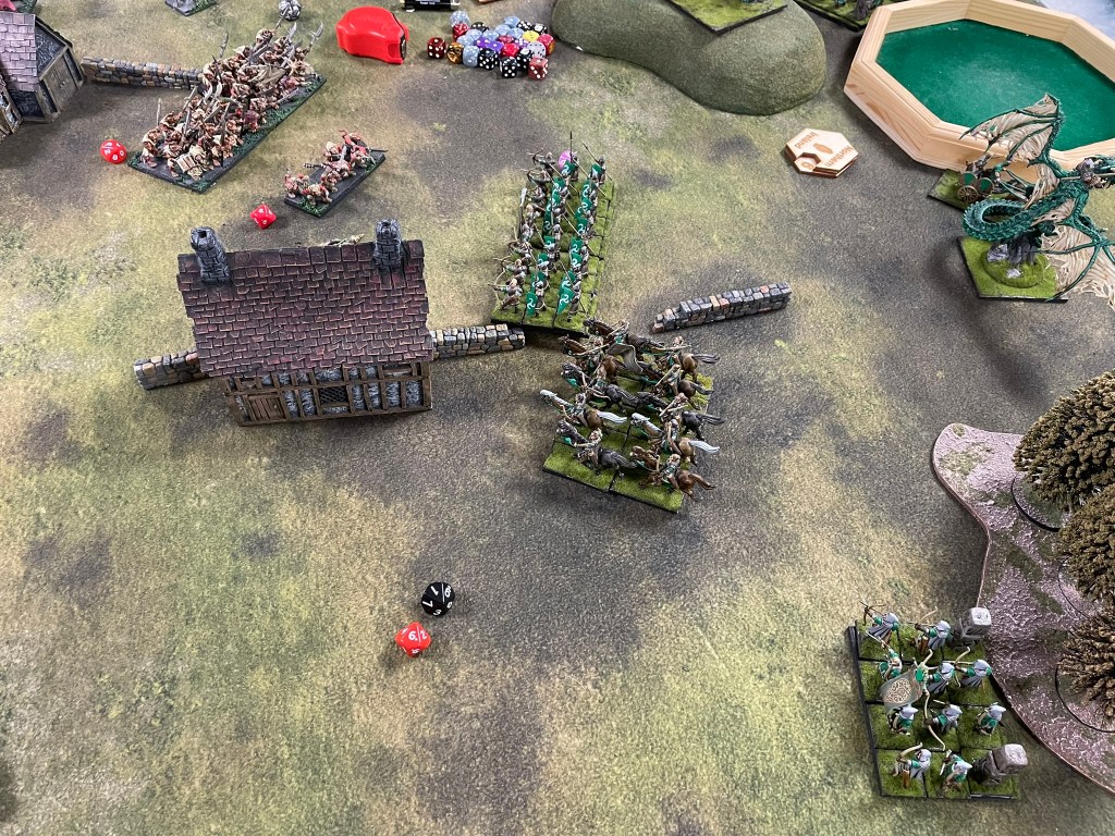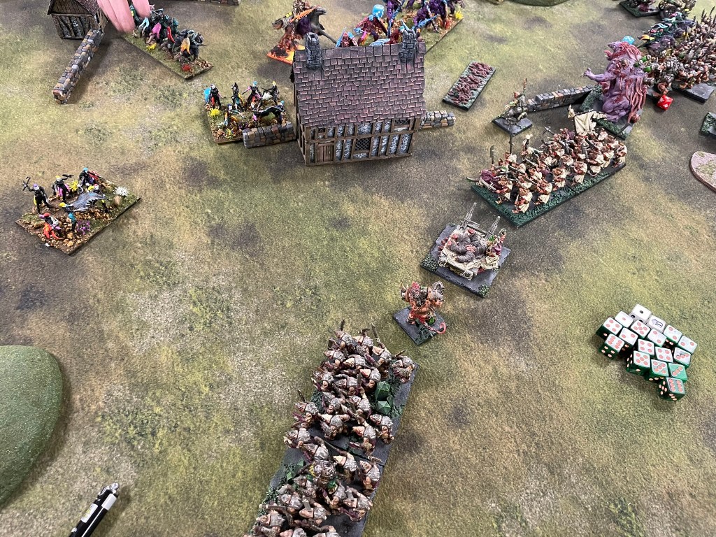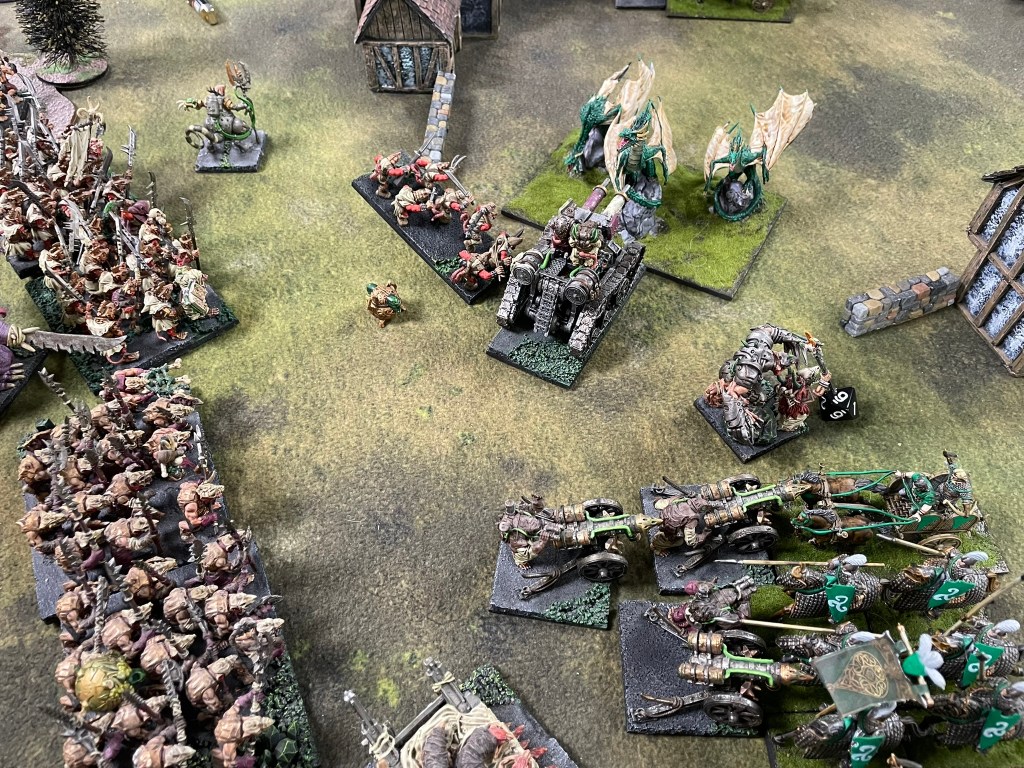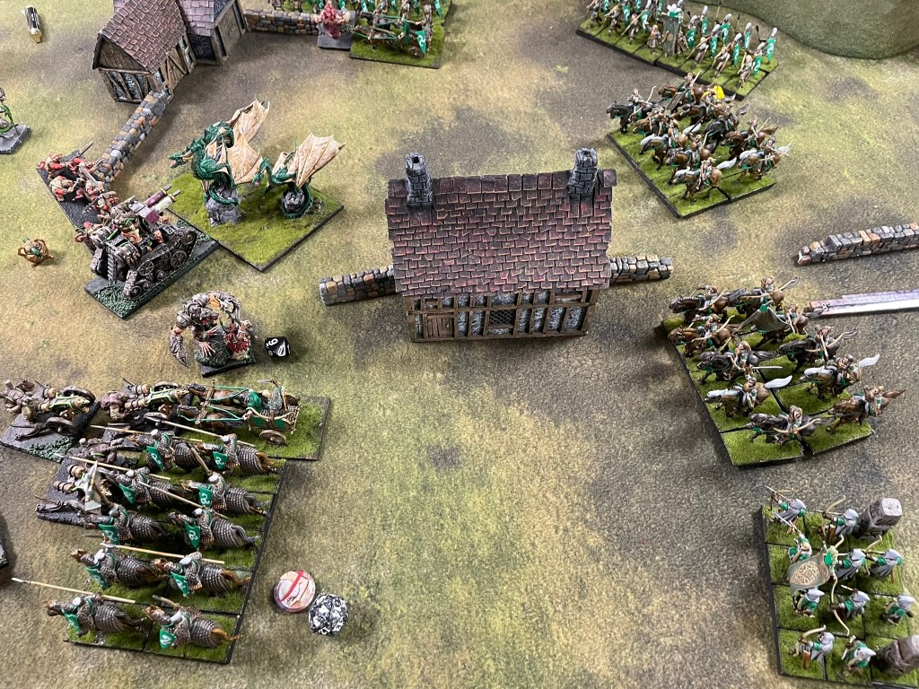 The game started predictably enough with the elves shooting off my warrior horde in the first turn! Not a great experience. I would go on to lose the Vermintide and a Brute Enforcer before I could get stuck into the Elves properly. I’d deployed all of my troops on my left flank, whilst the bulk of the Elves ranged from the centre to my right. Only the dragon and a regiment of Gladestalkers challenged me for the left. In the second turn the dragon charged my Mutant Rat Fiend, which resulted in the dragon getting flank charged and routed by Shock Troops, whilst my spear horde dealt with the Gladestalkers. It was a great moment to have a couple of units over the centre line and some safe space for them away from the main battle, but the bulk of the enemy still needed to be dealt with.