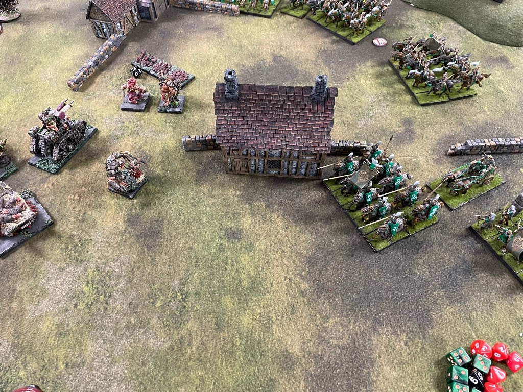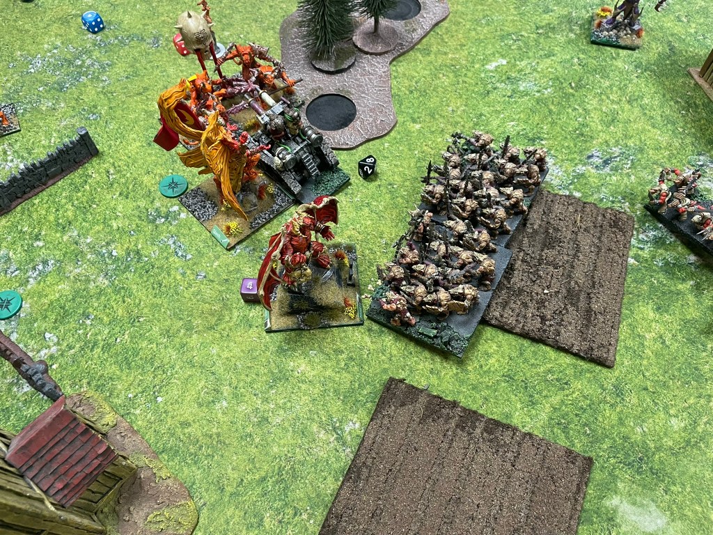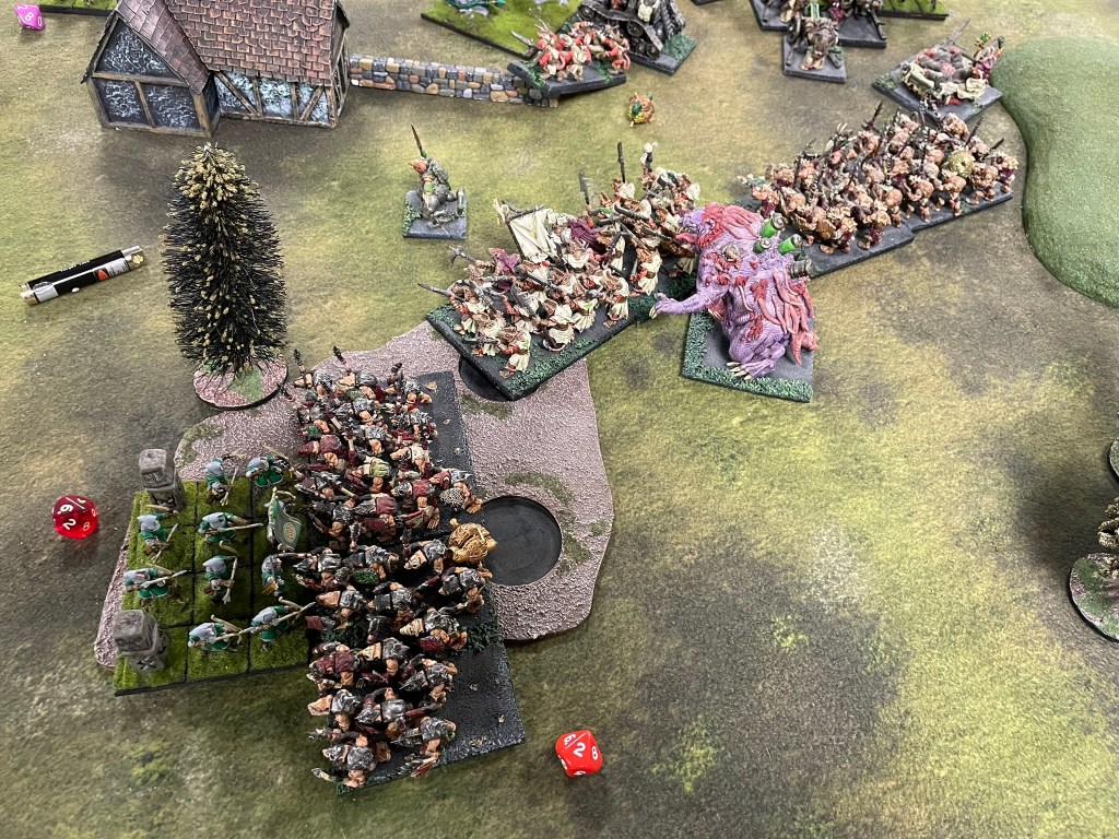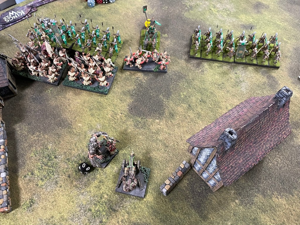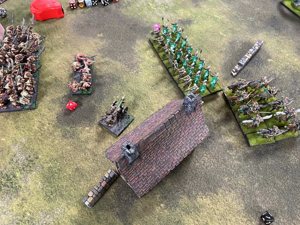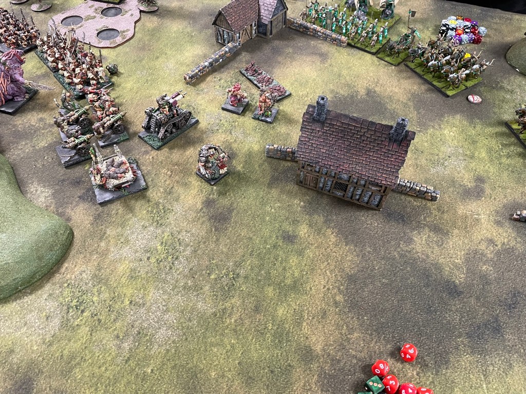 The first game was against a classic third edition Elven shooting list. Shooting is changing quite a bit in fourth edition, and I get why. I haven’t played against loads of these types of lists, by when I do there’s always a feeling of trepidation. The match up feels a little one-sided, loads of mobile shooting against quite slow-moving infantry with short ranged guns. The scenario went in my favour though, we were playing Invade, which meant my opponent needed to move units forward, so couldn’t keep moving his archers backwards to keep my troops at arm’s length for as long as possible.