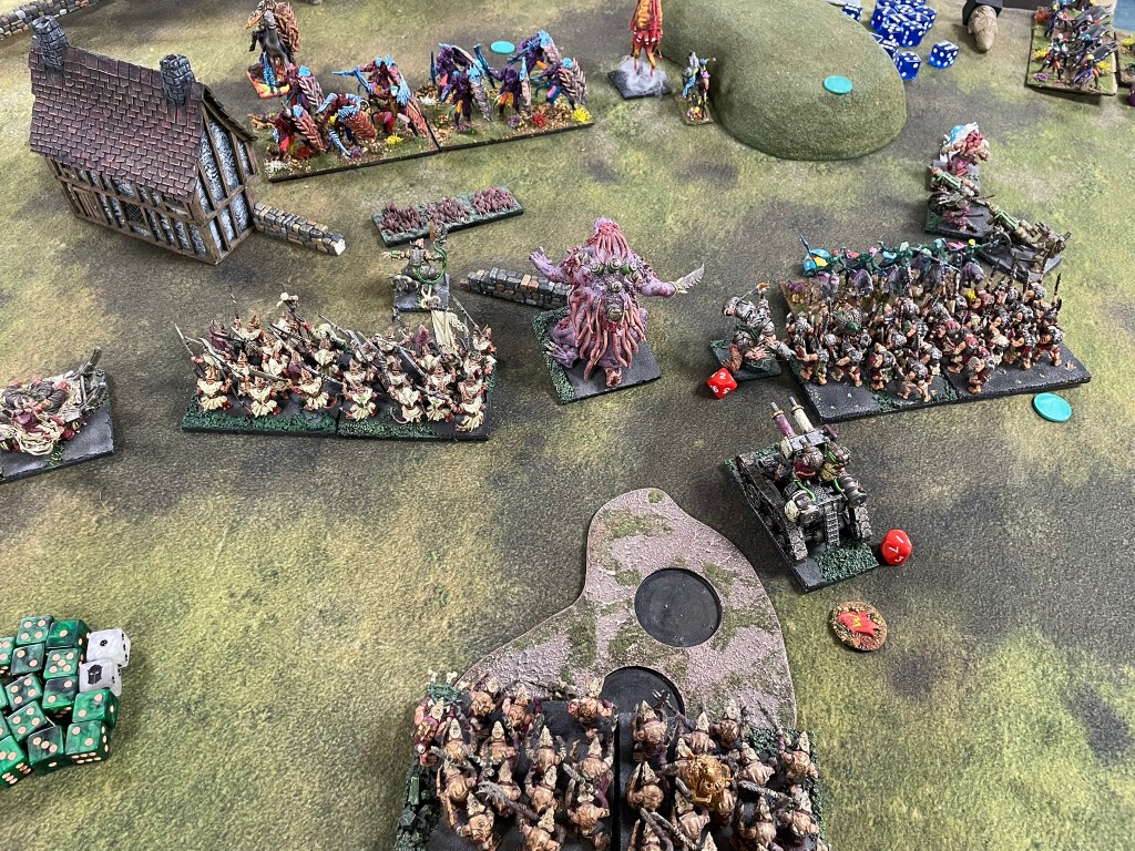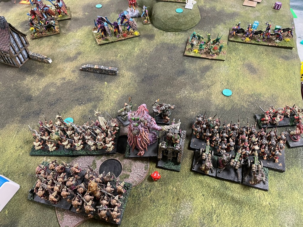 As my battleline crept forward towards the centre the surviving Brute Enforcer managed to stop one of the Sea Guard hordes shooting. As the Elves were also trying to get units across into my half of the table to score, their ranged attacks were watered down, allowing me to get more units into charge range. An attempt to slow my advance by the Drakon Riders was firmly rebuffed and combat started to be joined in earnest. One of the Sea Guard hordes went down, the two charioteers were both lost, and the Stormwind Cavalry were pulled apart by Shock Troops. Despite them retaining three of their units, Silverbreeze, Gladestalkers and Seaguard, the Elves weren’t able to do enough damage to the remaining blocks of rats or their Brood Mother resulting in a win for the rats.