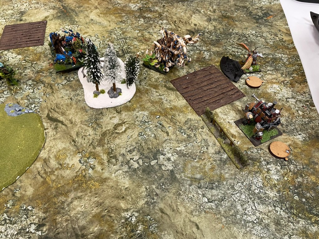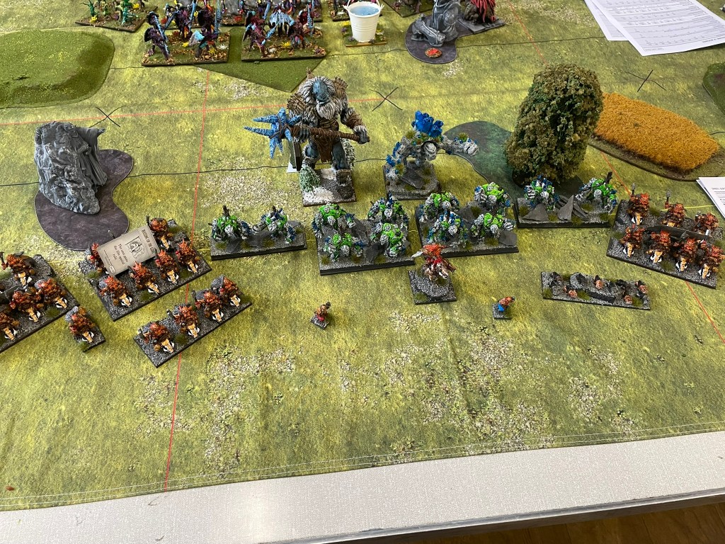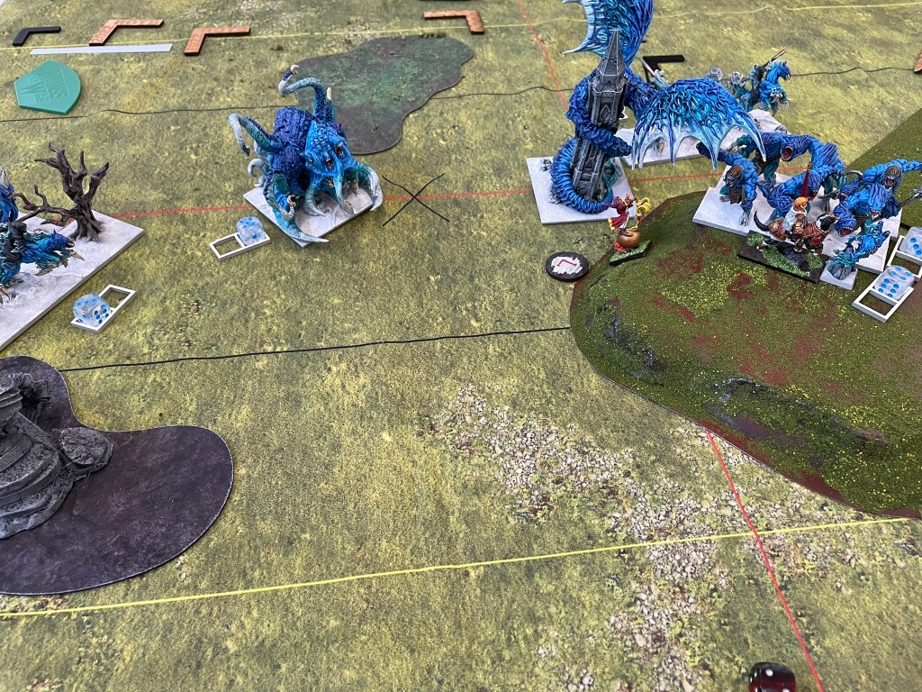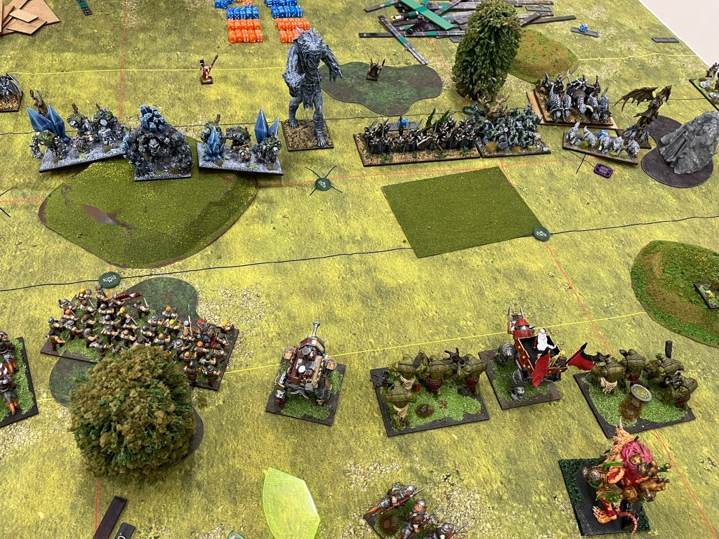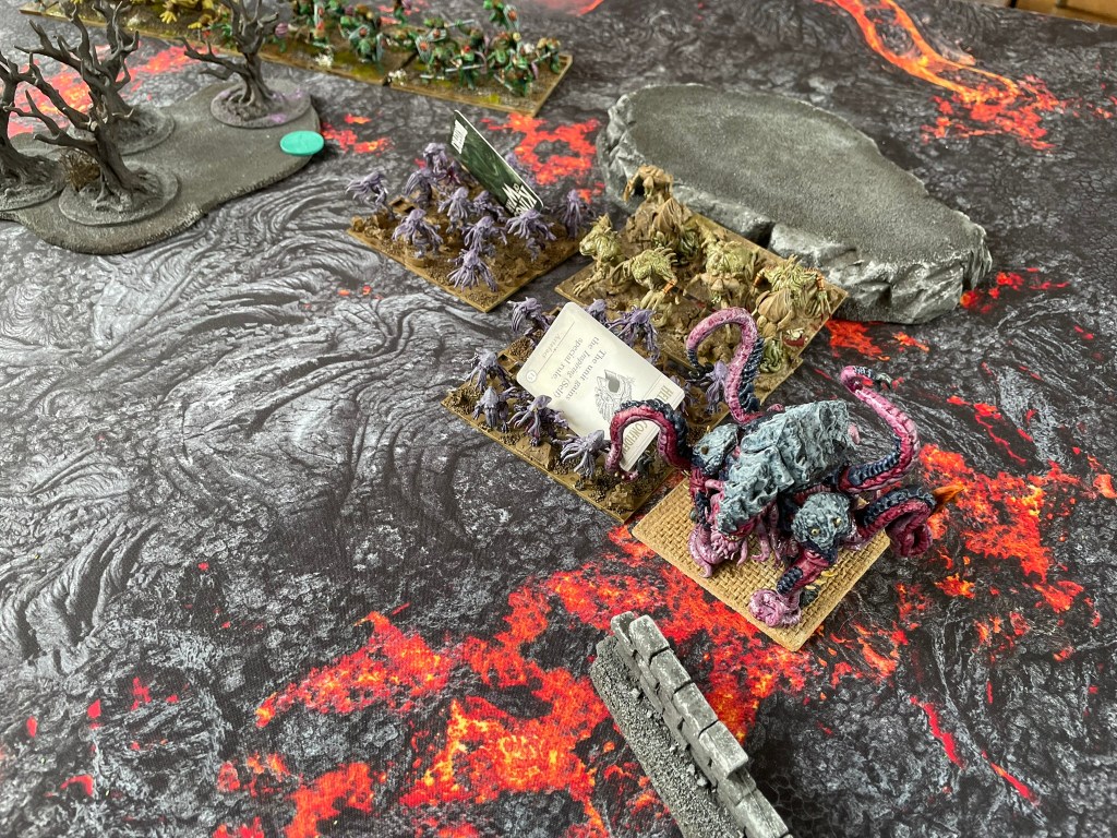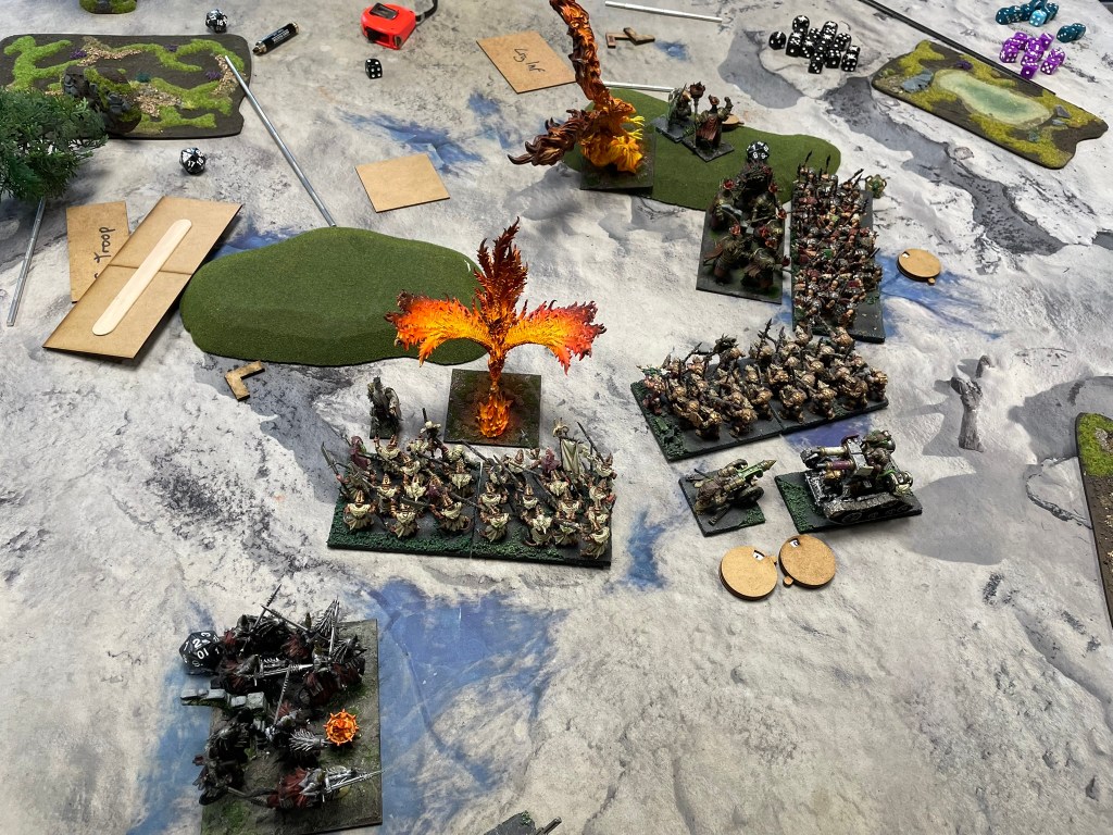 In the limited time I’d spent playing with the monster creator I hadn’t given much thought to the shooting options. I’d kind of assumed they would be limited to a bit of fireball or lightening bolt. Not the case. Chris (and a couple of the higher ranked players at the event) had created living artillery capable of delivery up to around 30 shots, with piercing 2, range 24” and the height of the titans meant they could pretty much shoot at whatever they wanted.