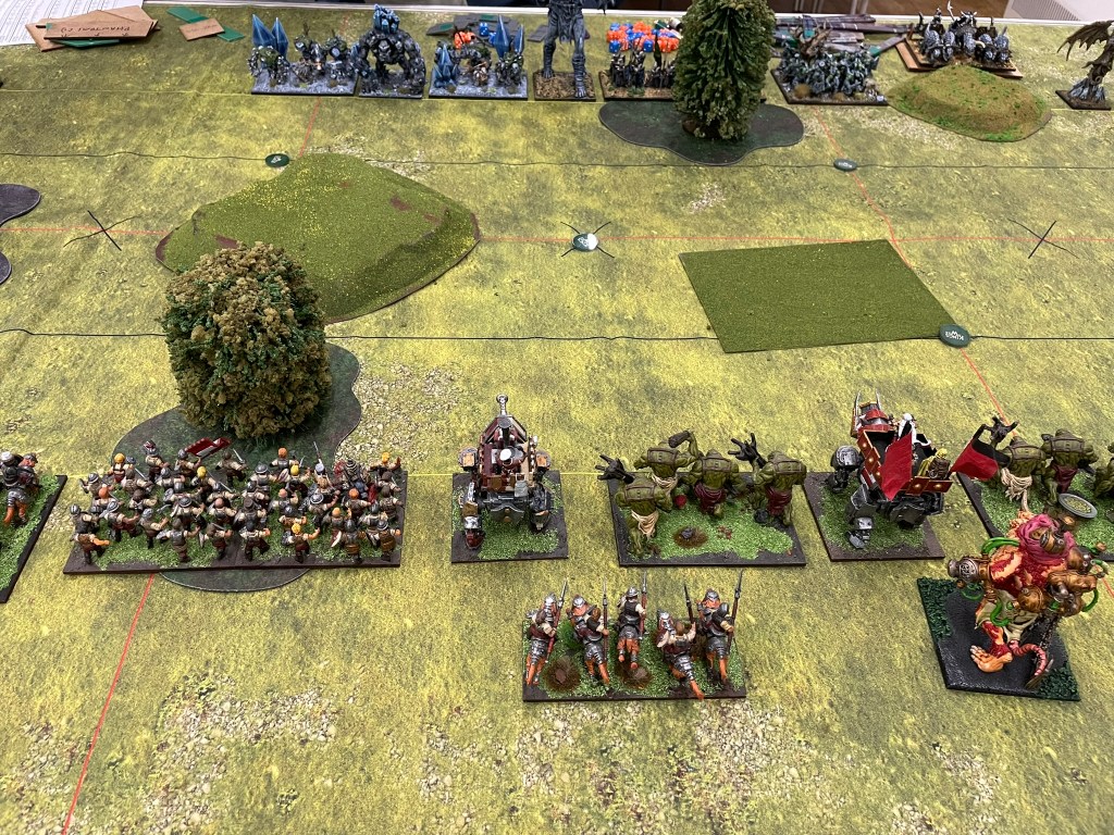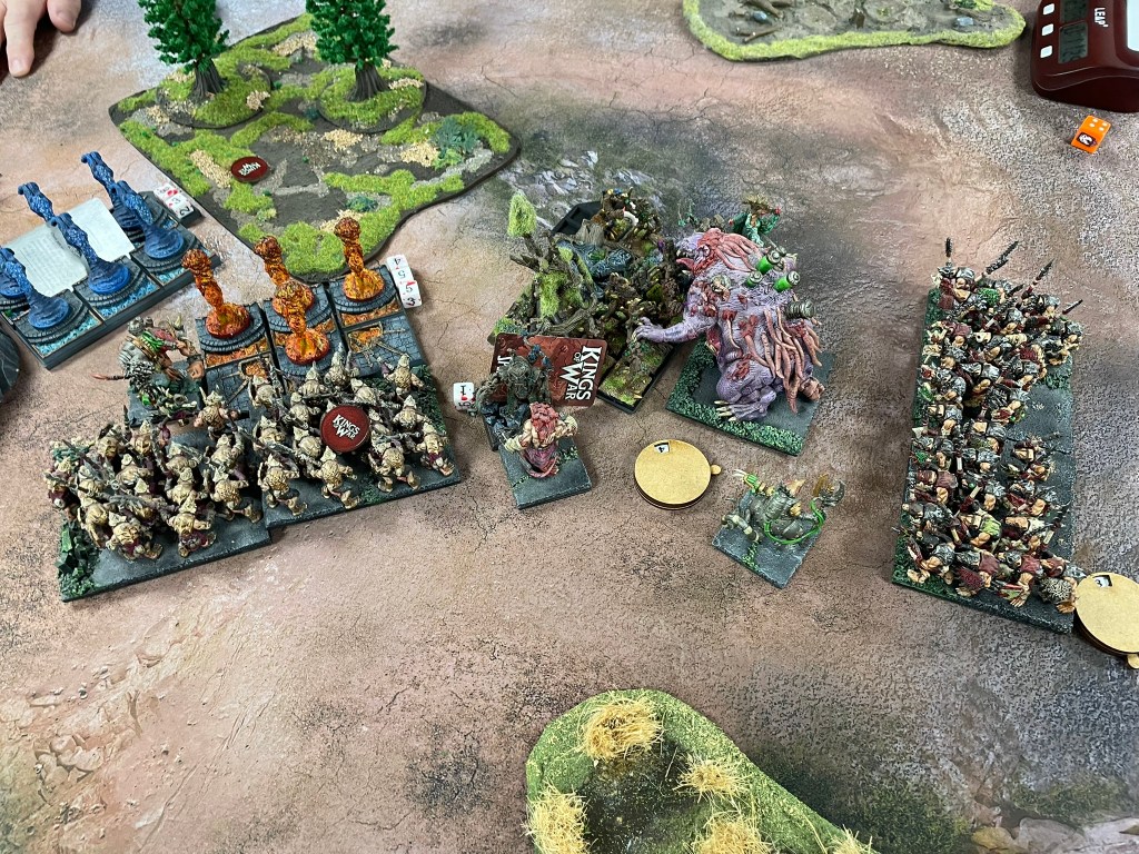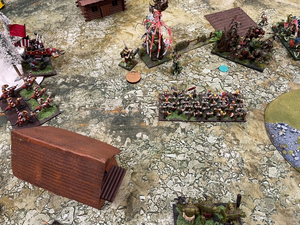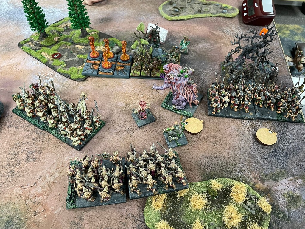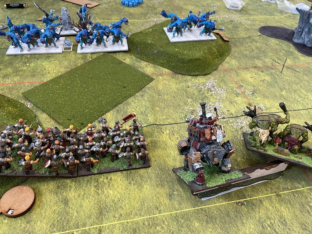 In the limited time I’d spent playing with the monster creator I hadn’t given much thought to the shooting options. I’d kind of assumed they would be limited to a bit of fireball or lightening bolt. Not the case. Chris (and a couple of the higher ranked players at the event) had created living artillery capable of delivery up to around 30 shots, with piercing 2, range 24” and the height of the titans meant they could pretty much shoot at whatever they wanted.