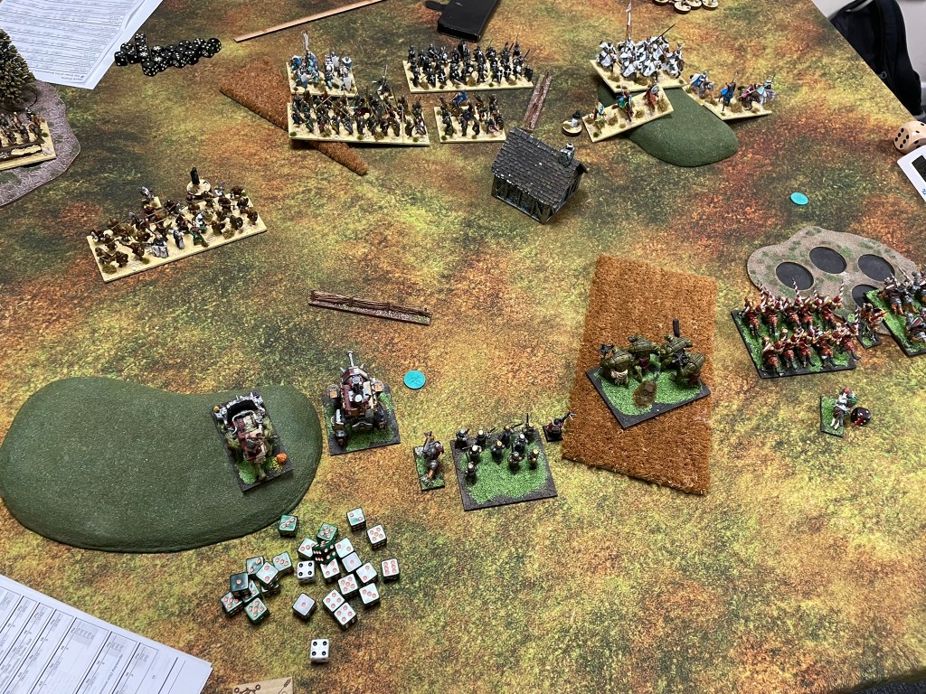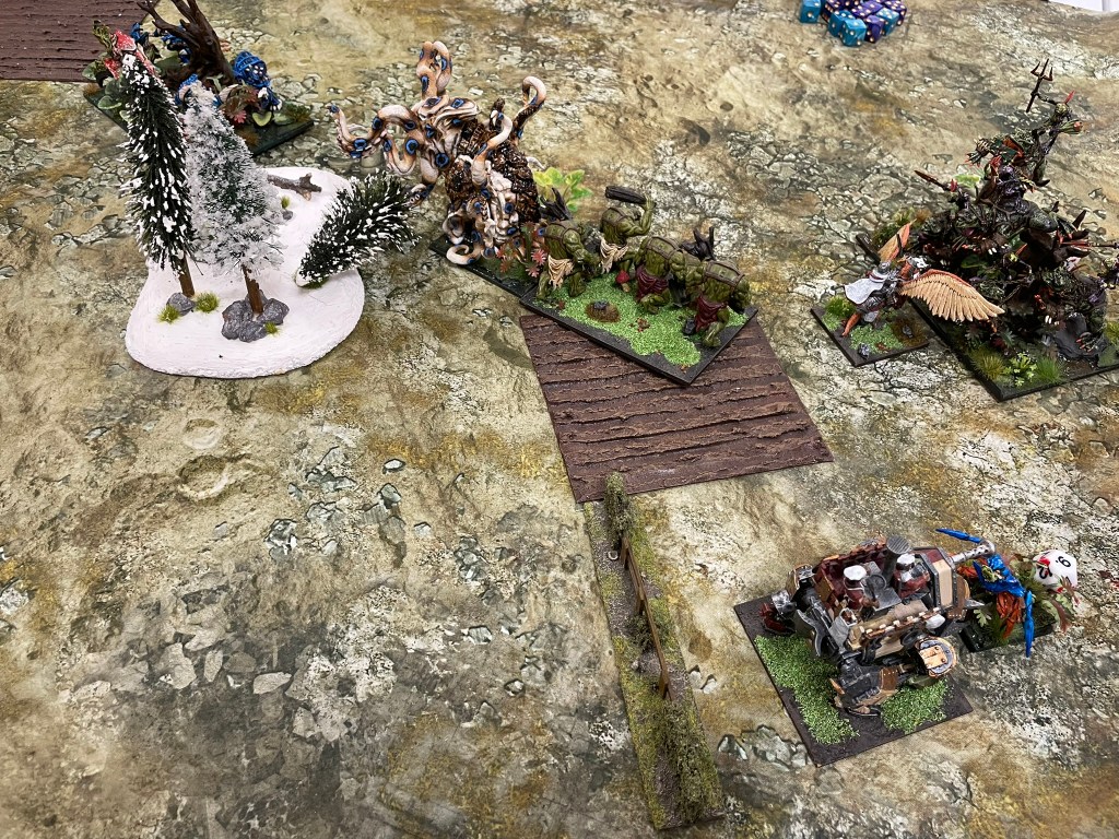 What followed was an absolute blood bath as the titan proceeded to dish out an average of around 9 points of damage to a different unit every turn. Add to that Chris’ aptitude for the game and a couple of unfortunate nerve checks that just feel short of taking enemy units off the table and by turn 3 the game was basically over. Not only did I lose everything, but I only managed to kill a single Mind Screech. Not the best start to the day, but an interesting game none the less.