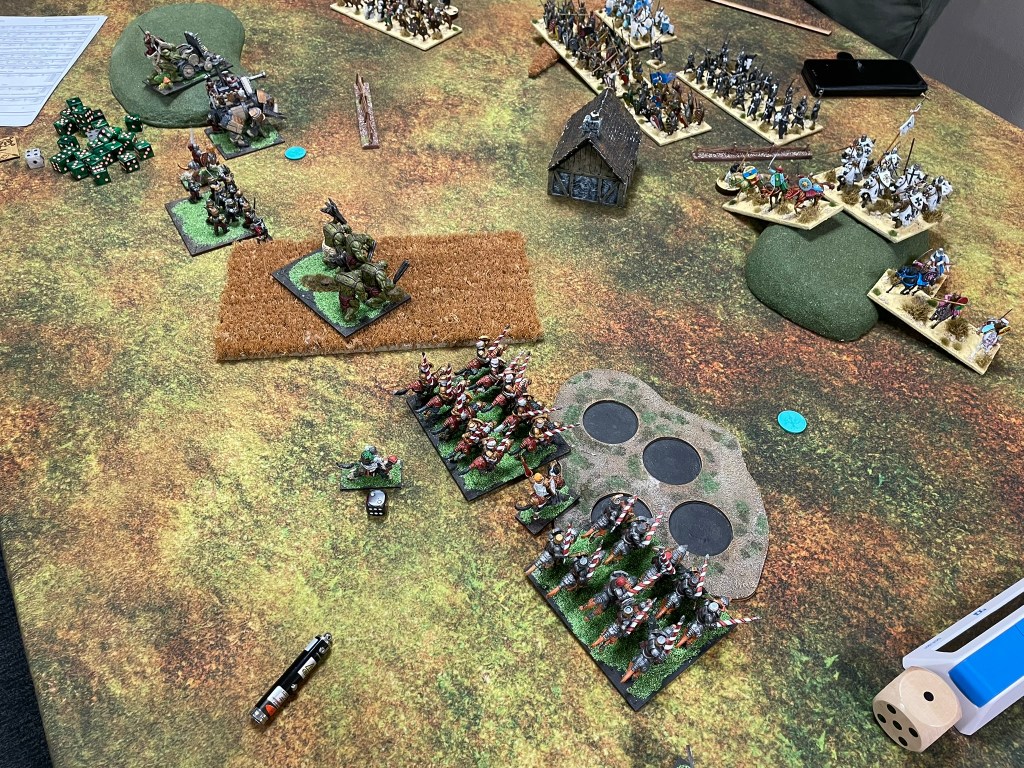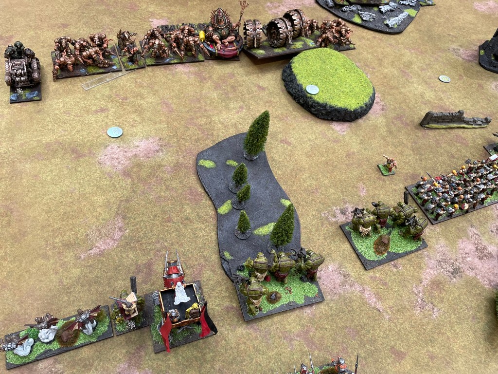 The right flank very quickly became a grinding melee as the Halfings sought to take advantage of their good fortune, whilst the Herd did their best to fight them off. A lot of poor charge options meant the Avatar of the Father flank charged one of the troll hordes, and whilst the trolls dissolved in the face of the mighty creature, the Avatar found himself facing an Iron Beast and the remaining trolls. His demise was quick, and despite the Chieftain’s best efforts, the rest of the flank started to flee back towards the forests.