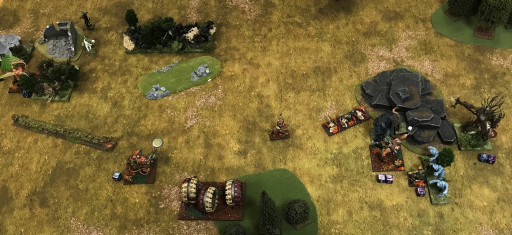 As the Hackpaws had marched to their doom Warchief Bludjar decided it was time to lend his support to the centre of the field. He made his way towards the small clump of trees, skirting behind the Mutant Rat Fiend.